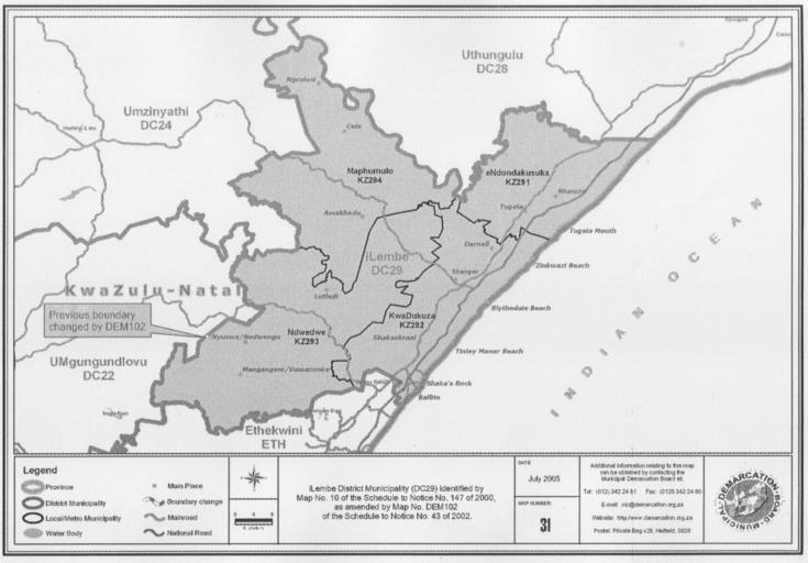 Keywords: Map No. 31 of Schedule 2 to Notice 1998 of 2005.png Notice 1998 of 2005 Depicts the boundaries of the iLembe District Municipality File Notice 1998 of 2005 djvu Municipal Demarcation Board of South Africa 2005-10-31 PD-South-Africa-exempt Maps of KwaZulu-Natal municipalities with 2006 borders Notice 1998 of 2005 |