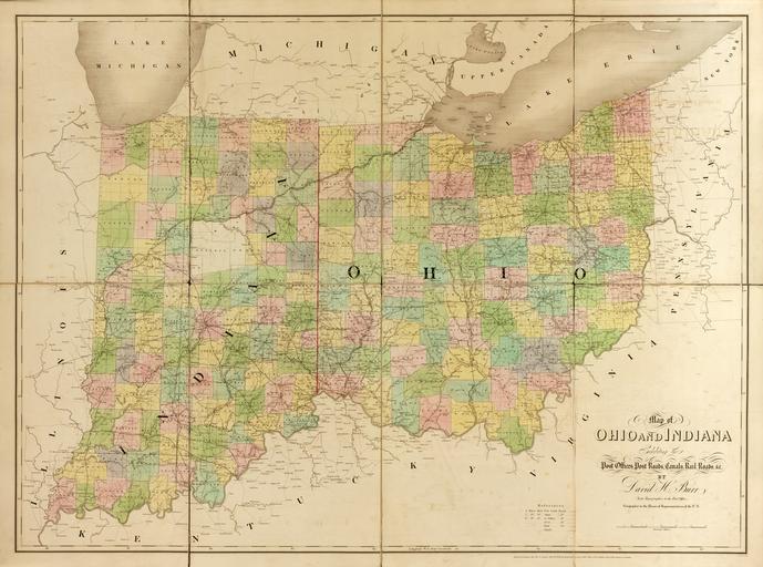 | Keywords: Map of Ohio and Indiana WDL9600.png Artwork ru Бу Дэвид Г 1803-1875 гг fr Burr David H 1803-1875 en Burr David H 1803-1875 zh 大卫·伯尔,1803-1875 年 pt Burr David H 1803-1875 ar ديفيد بور، 1803-1875 es Burr David H 1803-1875 ru Ка та штатов Огайо и Индиана fr Carte de l'Ohio et de l'Indiana en Map of Ohio and Indiana zh 俄亥俄州和印第安纳州 图 pt Mapa de Ohio e Indiana ar خريطة أوهايو وإنديانا ru Дэвид Г Бу 1803 1875 гг землеме и ка тог аф служил топог афом Почтового депа тамента США в 1832 1838 гг и геог афом Палаты п едставителей в 1838 1847 гг Под уководством гене ального почтмейсте а Бу соби ал от почтмейсте ов всей ст аны инфо мацию о т анспо тных ма ш утах почтовых т актах железных до огах и каналах а также о асположении почтовых отделений с целью выпуска большого комплекта госуда ственных и егиональных ка т Опубликованный в 1839 г известной лондонской ка тог афической фи мой Джона Э оусмита <em> Аме иканский атлас </em> Бу а п едставлял под обную ка тину заселения и т анспо тных ма ш утов в Соединенных Штатах Аме ики за несколько десятилетий до Г ажданской войны Здесь п едставлена составленная Бу ом ка та штатов Огайо и Индиана одна из 13 ка т атласа Пе воначально составляя часть Севе о-западной те ито ии Огайо был заселен фе ме ами из овой Англии многие из кото ых были вете анами Войны за независимость получившими землю в качестве платы за свою военную службу Он стал 17-м штатом 3 ма та 1801 году В 1811-1813 гг Индиана являлась местом к овавых с ажений между поселенцами и союзом индейских племен возглавляемым известным вождем шауни Текумсе 1768 1813 гг Индейцы и их б итанские союзники поте пели по ажение и Индиана стала 19-м штатом Союза 11 декаб я 1816 года <br>Каналы; Э и озе о; ичиган озе о; Почтовые т акты; Почтовая служба; Железные до оги fr Géomètre et cartographe David H Burr 1803-1875 fut topographe au Département des Postes des États-Unis entre 1832 et 1838 puis géographe à la Chambre des représentants entre 1838 et 1847 Sous la direction du Maître des postes général Burr compila les informations fournies par les maîtres des postes à travers le pays concernant les routes routes postières chemins de fer et cours d'eau et l'emplacement des bureaux de poste afin de réaliser une importante série de cartes des États et des régions Publié en 1839 par l'éminente société cartographique de John Arrowsmith <em>L'atlas américain</em> de Burr représente de façon détaillée la répartition du peuplement et du transport aux États-Unis quelques dizaines d'années avant la guerre de Sécession La carte de Burr exposée ici représentant l'Ohio et l'Indiana fait partie des 13 cartes de l'atlas Faisant à l'origine partie du Territoire du Nord-Ouest l'Ohio était colonisé par des fermiers de la Nouvelle-Angleterre dont la plupart étaient des vétérans de la guerre d'indépendance ayant reçu des terres en paiement de leur service militaire Il devint le 17<sup>e</sup> État le 3 mars 1801 L'Indiana fut le théâtre de batailles sanglantes entre 1811 et 1813 entre les colons et une alliance de tribus indiennes menée par le célèbre chef shawnee Tecumseh 1768-1813 Les Indiens et leurs alliés britanniques furent vaincus et l'Indiana devint le 19<sup>e</sup> État de l'Union le 11 décembre 1816 <br>Canaux; Érié lac; Michigan lac; Routes postières; Service postal; Chemins de fer en David H Burr 1803 75 was a surveyor and cartographer who served as topographer to the United States Post Office Department in 1832 38 and as geographer to the House of Representatives in 1838 47 Under the direction of the postmaster general Burr compiled information from postmasters throughout the country about transportation routes post roads railroads and canals and the location of post offices to produce a large set of state and regional maps Published in 1839 by the prominent London mapmaking firm of John Arrowsmith Burr s <em>The American Atlas</em> offers a detailed picture of settlement and transportation patterns in the United States in the decades before the Civil War Shown here is Burr s map of Ohio and Indiana one of 13 maps in the atlas Originally part of the Northwest Territory Ohio was settled by farmers from New England many of them Revolutionary War veterans who received land as payment for their military service It became the 17th state on March 3 1801 Indiana was the scene of bloody battles in 1811 13 between settlers and an alliance of Indian tribes led by the famous Shawnee chief Tecumseh 1768 1813 The Indians and their British allies were defeated and Indiana became the 19th state of the Union on December 11 1816 <br>Canals; Erie Lake; Michigan Lake; Post roads; Postal service; Railroads zh 大卫·伯尔(David H Burr,1803-1875 年)是 位测量员和制图员,于 1832 1838 年担任美国邮政署 形学 ,1838 1847 年担任众议院 理学家 