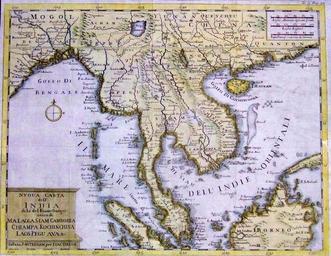 | Keywords: Map shows Indochina and Southeast Asia 1750.jpg en Hand colored copper engraved map titled Nvoua Carta dell' India di la' del Fiume Ganges overo di Malacca Siam Cambodia Chiampa Kochinchina Laos Pegu Ava c Map shows Indochina and Southeast Asia with the Bay of Bengal Singapore Sumatra Borneo and other cities Map published in Amsterdam by Isac Tirion 1750 http //www printsoldandrare com/asia/233asia jpg Isac Tirion 1750 PD-Art-100 Old maps of Southeast Asia 1750 maps | ||||