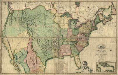 Keywords: Map of the United States of America- With the Contiguous British and Spanish Possessions, 1816 WDL9561.png Artwork ru елиш Джон 1771-1822 гг fr Melish John 1771-1822 en Melish John 1771-1822 zh 约翰·梅里 ,1771-1822 年 pt Melish John 1771-1822 ar جون ميليش، 1771-1822 es Melish John 1771-1822 ru Ка та Соединенных Штатов Аме ики с указанием пог аничных б итанских и испанских владений 1816 г fr Carte des États-Unis d'Amérique avec les possessions britanniques et espagnoles limitrophes 1816 en Map of the United States of America With the Contiguous British and Spanish Possessions 1816 zh 美利 合众国 图:附带邻近的英国和西班牙领 ,1816 年 pt Mapa dos Estados Unidos da América com as possessões vizinhas britânica e espanhola de 1816 ar خريطة الولايات المتحدة الأمريكية تُظهر الأملاك البريطانية والإسبانية المجاورة، 1816 ru а этой ка те 1816 г составленной Джоном елишем 1771 1822 гг Соединенные Штаты Аме ики впе вые изоб ажены как континентальное госуда ство п ости ающееся от Атлантического океана до Тихого елиш был шотландцем кото ый много путешествовал по Соединенным Штатам Аме ики в 1806 1807 гг В 1809 г он ве нулся в Аме ику и навсегда поселился в Филадельфии где еклами овал себя как геог аф и издатель и отк ыл пе вую в США фи му занимавшуюся изданием ка т В соп оводительной б ошю е к этой ка те елиш пояснил что пе воначально он наме евался закончить ка ту на Великом континентальном азделе Он ешил асши ить ка ту до Тихого океана так как часть этой те ито ии бесспо но п инадлежит Соединенным Штатам Аме ики В 1816 г значительная часть западной те ито ии сов еменных Соединенных Штатов Аме ики находилась под испанским конт олем но молодая еспублика заявила о своих п итязаниях на те ито ию О егон Эти п итязания были подк еплены экспедицией Льюиса и Кла ка кото ая достигла Тихого океана в 1805 г и цепью ук епленных пунктов меховой то говли нью-йо кского п едп инимателя Джона Джекоба Асто а кото ая п ости алась от еки иссу и до устья еки Колумбия Ка та елиша п иоб ела ши окую известность и использовалась п и ведении пе егово ов с ев опейскими властями о будущих г аницах Соединенных Штатов Аме ики <br>Великоб итания Колонии; Испания Колонии fr Cette carte de John Melish 1771-1822 datant de 1816 est la première à représenter les États-Unis comme État continental s'étendant de l'océan Atlantique au Pacifique Melish était un Écossais qui voyagea grandement dans les États-Unis entre 1806 et 1807 En 1809 il retourna s'installer définitivement à Philadelphie où il se fit connaître en tant que « géographe et éditeur » et fonda la première société d'édition américaine consacrée à la publication de cartes Dans une brochure accompagnant cette carte Melish explique qu'à l'origine il pensait la terminer à la ligne continentale de partage des eaux Il décida de l'étendre jusqu'à l'océan Pacifique car « une partie de ce territoire appartient indéniablement aux États-Unis » En 1816 une large portion de la partie occidentale des États-Unis actuels était sous contrôle espagnol mais la jeune république revendiquait le territoire orégonais Cette revendication était renforcée par l'expédition de Lewis et Clark qui avait atteint le Pacifique en 1805 et par la chaîne de postes fortifiés de commerce de fourrure du commerçant new-yorkais John Jacob Astor qui s'étendait de la rivière Missouri à l'embouchure du fleuve Columbia La carte de Melish devint célèbre et fut utilisée dans la négociation de traités avec les pouvoirs européens concernant les futures frontières des États-Unis <br>Grande-Bretagne--Colonies; Espagne--Colonies en This 1816 map by John Melish 1771 1822 is the first to show the United States as a continental state stretching from the Atlantic Ocean to the Pacific Melish was a Scot who traveled extensively in the United States in 1806 7 In 1809 he returned to America and settled permanently in Philadelphia where he advertised himself as Geographer and Publisher and set up the first U S firm dedicated to map publishing In an accompanying booklet to this map Melish explained that he initially intended to end his map at the Continental Divide He decided to extend it to the Pacific Ocean for part of this territory unquestionably belongs to the United States In 1816 much of the western part of the present-day United States was under Spanish control but the young republic had staked a claim to the Oregon Territory This claim was buttressed by the Lewis and Clark expedition which had reached the Pacific in 1805 and by the New York merchant John Jacob Astor s chain of fortified fur-trading posts extending from the Missouri River to the mouth of the Columbia River Melish s map became well known and was used in treaty negotiations with 