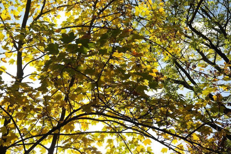 Keywords: maple tree leaves branches autumn color yellow light shadow back light sun