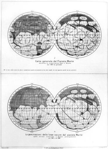 Keywords: Maps of Mars by Schiaparelli 1877-1882-1888.jpg Χάρτες του Άρη σχεδιασμένος α ό τον ιταλό αστρονόμο Τζιοβάννι Σκια αρέλλι με τα χαρακτηριστικά κανάλια ου λανθασμένα ιστευόταν ότι υ ήρχαν στον λανήτη Πάνω γενικός χάρτης του Άρη 1877 Κάτω αρουσιάζεται η εμφάνιση των καναλιών ανά δυο διδυμο οίηση α ό αρατηρήσεις του 1882 και 1888 Giovanni Schiaparelli's maps of Mars Top General map of Mars 1877 Bottom showing the twinning of Martian canals by observations from 1882 and 1888 http //keespopinga blogspot com/2010/07/schiaparelli-e-la-vita-su-marte html http //4 bp blogspot com/_m0w1jebh02s/TE8zKqQInMI/AAAAAAAABu0/N3KybRsuVX0/s1600/schiaparelli_1877 jpg file 1888 Creator Giovanni Schiaparelli PD-old-100 <gallery> File Mars twin canals by Schiaparelli jpg Bottom picture solo </gallery> Maps of Mars by Giovanni Schiaparelli Martian canals |