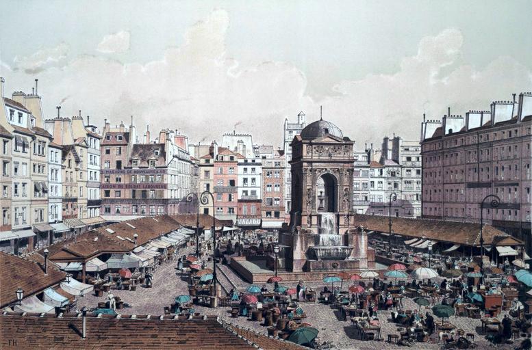Keywords: Marché des Innocents, 1855.jpg Artwork The Marché des Innocents was opened in 1788 in the place of what used to be Paris's largest cemetery the Cimetière des Innocents This market located in the first arrondissement served as a central location for Parisians to purchase various herbs and vegetables In addition to the hundreds of vendors the market also housed the occasional café and was at one time a place where homeless Parisians could go in the winter for a bowl of hot soup The Fontaine des Innocents originally erected in 1549 was transferred to the center of the market in the early 19th century Although highly decorative the fountain's four basins served as a sufficient source of water for the entire market The Marché des Innocents officially closed in 1858 to make way for the popular les Halles marketplace In 1865 the fontaine des Innocents was once again relocated to what is currently known as the Place des Innocents 1875-1882 lithograph 24 x 30 cm Institution Brown University Library object history exhibition history credit line Published in Theodor Josef Hubert Hoffbauer Paris à travers les âges Paris Firmin-Didot et cie 1885 accession number 1120658070700016 PD-old Lithographs of Paris Images of Paris from the Brown University Library Paris à travers les âges Marché des Innocents Historical images of Fontaine des Innocents 1855 in Paris |