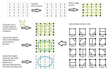 Keywords: Marchingsquaresalgorithm.png Marching_squares_algorithm svg Marching Squares Algorithm Marching Squares is an algorithm which can be used to extract isocontour geometry from an 2D image This algorithm is the 2D equivalent of isosurface extraction using Marching Cubes in 3D es Esta imagen describe los pasos del Algoritmo de Cuadrados Marchantes Este algoritmo puede ser usado para extraer los isocontornos de una imagen 2D Cuadrados Marchantes es el equivalente 2D al algoritmo de Cubos marchantes para el caso de extracción de isosuperficies en 3D own Djexplo 2011-02-24 Cc-zero Marching squares |