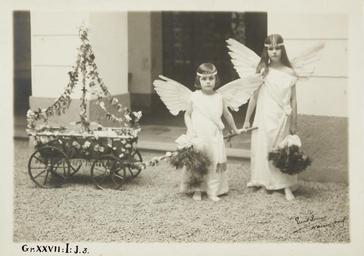 Keywords: Margit och Erik von Geijer utklädda till änglar, Wegeholms borg, 1914 - Hallwylska museet - 107985.tif LSH artwork sv FOTOGRAFIER m m FRÅN JULAFTNAR firade med familjen von Geijer 1 Från år 1913 på Wegeholm Fotografi Av Margit och Erik von Geijer som småbarn I högra nedre hörnet signerat Emil Bruno Hälsingborg Höjd 19 cm; bredd 11 cm Gåva till Wilhelmina von Hallwyl januari eller februari 1914 från hennes dotter Irma 2 Från år 1914 på Wegeholm Julgransflagga svensk Av silkespapper med stång av ståltråd Längs korsets horisontala del med svart bläck skrivet Hopp och Trohet Jul 1914 Längd 13 cm bredd 7 cm Stång längd 12 cm Gåva till Walther von Hallwyl Julaftonen 1914 från hans dotterdotter och dotterson Margit och Erik von Geijer Julgransflagga svensk och två fotografier Flagga Som den nyss beskrivna Fotografier På kort 1 Margit von Geijer som Svea stående med utslaget hår i fotsid vit dräkt med slöja pannband mörkt axelband och sandaler i högra handen Sveriges flagga med stången stödd mot marken i vänstra handen riksskölden med Lilla riksvapnet Tre kronor På kort 2 Erik von Geijer som tomte På båda i högra nedre hörnet signerat Emil Bruno Hälsingborg Kort 1 höjd 17 5 cm bredd 7 5 cm Kort 2 höjd 17 7 cm bredd 7 5 cm Gåva till Wilhelmina von Hallwyl Julaftonen 1914 från hennes dotterdotter och dotterson Margit och Erik von Geijer För beskrivning av julfirandet på Wegeholm se detta inv nummer i katalogverket Flaggorna inköpta av Irma von Geijer hos en handlare i Hälsingborg Fotografierna tagna Januari 1915 hos fotografen Emil Bruno Helsingborg 3 Från år 1915 på Wegeholm Solros Helianthus Av silkespapper och sammet med stjälk av ståltråd Blomkorg av gult kräpperat papper samt brun sammet stjälken lindad med grönt papper med foderblad och tre stjälkblad av dylikt papper Stjälk längd 31 cm Blomma diameter 14 cm Gåva till Walther von Hallwyl Julaftonen 1915 från hans dotterdotter och dotterson Margit och Erik von Geijer Solros Helianthus och två fotografier Solros Som den nyss beskrivna Fotografier På kort 1 Margit och Erik von Geijer stående hand i hand; båda klädda till änglar I högra nedre hörnet signerat Emil Bruno Hälsingborg Höjd 11 8 cm bredd 16 7 cm På kort 2 Samma barn stående i de s k arkaderna framför en dörr på Wegeholms borg samt hållande i dragstången till en blomstersmyckad liten vagn; båda klädda som på kort 1 Gåva till Wilhelmina von Hallwyl f Kempe julaftonen 1915 från Margit och Erik Geijer För detaljer om julfirandet se detta inv nr i katalogverket Fotografierna tagna Februari 1916 av fotografen Emil Bruno Helsingborg 4 Från år 1916 på Wegeholm Docka Lockigt ljusgult hår blåa ögon och röda läppar; clownkostym med bred krage och toppig mössa; på kostymen stora blåa rosetter av silkespapper Längd utan mössa 16 5 cm Mössa höjd 3 8 cm Gåva till Walther von Hallwyl julaftonen 1916 från Margit och Erik von Geijer Docka och fotografi Docka Som den nyss beskrivna Fotografi Margit och Erik von Geijer som Pierrette och Pierrot I högra nedre hörnet signerat Emil Bruno Hälsingborg Höjd 17 9 cm Bredd 12 4 cm Gåva till Wilhelmina von Hallwyl f Kempe Julaftonen 1916 från Margit och Erik von Geijer För detaljer om julfirandet se detta inv nr i katalogverket 5 Från år 1917 i Hamngatan 4 Stockholm Stjärna med spira Stjärna av guldpapper spira av trä Längd 34 5 cm Stjärna diameter 12 cm Spira längd 25 cm Gåva till Walther von Hallwyl Julaftonen 1917 från Margit och Erik von Geijer För detaljer om julfirandet se detta inventarienummer i katalogverket Fotografien tagen Februari 1918 av fotografen Herm Hamnqvist Atelier Bruno Södra Storgatan 3 Helsingborg 6 Från år 1918 i Hamngatan 4 Stockholm Penséer två stycken Av vitt s k engelskt skinn bomullssatin med stjälk av ståltråd Pressade samt handmålade i färger den ena med vit och den andra med gul mitt; stjälkarna gröna lindade med tyg som blommorna vardera med ett grönt stjälkblad Längd omkring 18 cm Gåva till Walther von Hallwyl julaftonen 1918 från Margit och Erik von Geijer Penséer två stycken och fotografi Penséer Som de nyss beskrivna Fotografi Margit och Erik von Geijer stående klädda till penséer Till höger om bilderna signerat Ferd Flodin -19 Höjd 22 8 cm Bredd 14 5 cm Gåva till Wilhelmina von Hallwyl Julaftonen 1918 från Margit och Erik von Geijer Penséerna inköpta av Irma von Geijer hos en handlare i Helsingborg Fotografien tagen 28 December 1918 av fotografen Ferd Flodin Hamngatan 3 A Stockholm 7 Från år 1919 i Hamngatan 4 Stockholm Snöboll Av vit bomullsvadd Oregelbundet klotrund utanpå beströdd med frostliknande silverglitter samt utan snöre Genomskärning omkring 4 cm Gåva till Walther von Hallwyl Julaftonen 1919 från Margit och Erik von Geijer Snöboll och fotografi Snöboll Som den nyss beskrivna Fotografi Margit och Erik von Geijer stående vända halvt åt vänster Den förstnämnda till höger båda i stor rund mössa och lång kappa av vadd med glitter samt vita strumpor; framför figurerna två stora snöbollar I högra nedre hörnet signerat Brink Foto Höjd 16 6 cm Bredd 11 2 cm Gåva till Wilhelmina von Hallwyl f Kempe julaftonen 1919 från Margit Johanna och Erik von Geijer För detaljer om julfirandet se detta inv nr i katalogverket Snöbollarna inköpta av Irma von Geijer i Buttericks Mönsteraffär Stockholm Fotografien tagen Januari 1920 av fotografen Gustaf Brink Ängelholm 8 Från år 1920 i Hamngatan 4 Stockholm Skogstomte I form av en brandgul flugsvamp Av tyg bommullsvadd och trä m m Höjd 10 8 cm Hatt diameter 9 1 cm Fotplatta diameter 5 9 cm Gåva till Walther von Hallwyl Julaftonen 1920 från Margit och Erik von Geijer Skogstomte och fotografi Skogstomte Som den nyss beskrivna men röd med vita plättar på svamphatten på kortet vid högra änden målat ett paket under en drypande lacktång Fotografi Margit och Erik von Geijer samt Elionore J