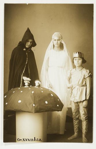 Keywords: Margit och Erik von Geijer samt Elionore Joseph. Erik prins, Margit som fe. Elionore som häxa, 1920 - Hallwylska museet - 107989.tif LSH artwork sv FOTOGRAFIER m m FRÅN JULAFTNAR firade med familjen von Geijer 1 Från år 1913 på Wegeholm Fotografi Av Margit och Erik von Geijer som småbarn I högra nedre hörnet signerat Emil Bruno Hälsingborg Höjd 19 cm; bredd 11 cm Gåva till Wilhelmina von Hallwyl januari eller februari 1914 från hennes dotter Irma 2 Från år 1914 på Wegeholm Julgransflagga svensk Av silkespapper med stång av ståltråd Längs korsets horisontala del med svart bläck skrivet Hopp och Trohet Jul 1914 Längd 13 cm bredd 7 cm Stång längd 12 cm Gåva till Walther von Hallwyl Julaftonen 1914 från hans dotterdotter och dotterson Margit och Erik von Geijer Julgransflagga svensk och två fotografier Flagga Som den nyss beskrivna Fotografier På kort 1 Margit von Geijer som Svea stående med utslaget hår i fotsid vit dräkt med slöja pannband mörkt axelband och sandaler i högra handen Sveriges flagga med stången stödd mot marken i vänstra handen riksskölden med Lilla riksvapnet Tre kronor På kort 2 Erik von Geijer som tomte På båda i högra nedre hörnet signerat Emil Bruno Hälsingborg Kort 1 höjd 17 5 cm bredd 7 5 cm Kort 2 höjd 17 7 cm bredd 7 5 cm Gåva till Wilhelmina von Hallwyl Julaftonen 1914 från hennes dotterdotter och dotterson Margit och Erik von Geijer För beskrivning av julfirandet på Wegeholm se detta inv nummer i katalogverket Flaggorna inköpta av Irma von Geijer hos en handlare i Hälsingborg Fotografierna tagna Januari 1915 hos fotografen Emil Bruno Helsingborg 3 Från år 1915 på Wegeholm Solros Helianthus Av silkespapper och sammet med stjälk av ståltråd Blomkorg av gult kräpperat papper samt brun sammet stjälken lindad med grönt papper med foderblad och tre stjälkblad av dylikt papper Stjälk längd 31 cm Blomma diameter 14 cm Gåva till Walther von Hallwyl Julaftonen 1915 från hans dotterdotter och dotterson Margit och Erik von Geijer Solros Helianthus och två fotografier Solros Som den nyss beskrivna Fotografier På kort 1 Margit och Erik von Geijer stående hand i hand; båda klädda till änglar I högra nedre hörnet signerat Emil Bruno Hälsingborg Höjd 11 8 cm bredd 16 7 cm På kort 2 Samma barn stående i de s k arkaderna framför en dörr på Wegeholms borg samt hållande i dragstången till en blomstersmyckad liten vagn; båda klädda som på kort 1 Gåva till Wilhelmina von Hallwyl f Kempe julaftonen 1915 från Margit och Erik Geijer För detaljer om julfirandet se detta inv nr i katalogverket Fotografierna tagna Februari 1916 av fotografen Emil Bruno Helsingborg 4 Från år 1916 på Wegeholm Docka Lockigt ljusgult hår blåa ögon och röda läppar; clownkostym med bred krage och toppig mössa; på kostymen stora blåa rosetter av silkespapper Längd utan mössa 16 5 cm Mössa höjd 3 8 cm Gåva till Walther von Hallwyl julaftonen 1916 från Margit och Erik von Geijer Docka och fotografi Docka Som den nyss beskrivna Fotografi Margit och Erik von Geijer som Pierrette och Pierrot I högra nedre hörnet signerat Emil Bruno Hälsingborg Höjd 17 9 cm Bredd 12 4 cm Gåva till Wilhelmina von Hallwyl f Kempe Julaftonen 1916 från Margit och Erik von Geijer För detaljer om julfirandet se detta inv nr i katalogverket 5 Från år 1917 i Hamngatan 4 Stockholm Stjärna med spira Stjärna av guldpapper spira av trä Längd 34 5 cm Stjärna diameter 12 cm Spira längd 25 cm Gåva till Walther von Hallwyl Julaftonen 1917 från Margit och Erik von Geijer För detaljer om julfirandet se detta inventarienummer i katalogverket Fotografien tagen Februari 1918 av fotografen Herm Hamnqvist Atelier Bruno Södra Storgatan 3 Helsingborg 6 Från år 1918 i Hamngatan 4 Stockholm Penséer två stycken Av vitt s k engelskt skinn bomullssatin med stjälk av ståltråd Pressade samt handmålade i färger den ena med vit och den andra med gul mitt; stjälkarna gröna lindade med tyg som blommorna vardera med ett grönt stjälkblad Längd omkring 18 cm Gåva till Walther von Hallwyl julaftonen 1918 från Margit och Erik von Geijer Penséer två stycken och fotografi Penséer Som de nyss beskrivna Fotografi Margit och Erik von Geijer stående klädda till penséer Till höger om bilderna signerat Ferd Flodin -19 Höjd 22 8 cm Bredd 14 5 cm Gåva till Wilhelmina von Hallwyl Julaftonen 1918 från Margit och Erik von Geijer Penséerna inköpta av Irma von Geijer hos en handlare i Helsingborg Fotografien tagen 28 December 1918 av fotografen Ferd Flodin Hamngatan 3 A Stockholm 7 Från år 1919 i Hamngatan 4 Stockholm Snöboll Av vit bomullsvadd Oregelbundet klotrund utanpå beströdd med frostliknande silverglitter samt utan snöre Genomskärning omkring 4 cm Gåva till Walther von Hallwyl Julaftonen 1919 från Margit och Erik von Geijer Snöboll och fotografi Snöboll Som den nyss beskrivna Fotografi Margit och Erik von Geijer stående vända halvt åt vänster Den förstnämnda till höger båda i stor rund mössa och lång kappa av vadd med glitter samt vita strumpor; framför figurerna två stora snöbollar I högra nedre hörnet signerat Brink Foto Höjd 16 6 cm Bredd 11 2 cm Gåva till Wilhelmina von Hallwyl f Kempe julaftonen 1919 från Margit Johanna och Erik von Geijer För detaljer om julfirandet se detta inv nr i katalogverket Snöbollarna inköpta av Irma von Geijer i Buttericks Mönsteraffär Stockholm Fotografien tagen Januari 1920 av fotografen Gustaf Brink Ängelholm 8 Från år 1920 i Hamngatan 4 Stockholm Skogstomte I form av en brandgul flugsvamp Av tyg bommullsvadd och trä m m Höjd 10 8 cm Hatt diameter 9 1 cm Fotplatta diameter 5 9 cm Gåva till Walther von Hallwyl Julaftonen 1920 från Margit och Erik von Geijer Skogstomte och fotografi Skogstomte Som den nyss beskrivna men röd med vita plättar på svamphatten på kortet vid högra änden målat ett paket under en drypande lacktång Fotografi Margit och Er