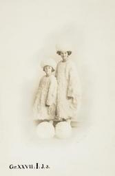 Keywords: Margit och Erik von Geijer som snöbollar, 1919 - Hallwylska museet - 107988.tif LSH artwork sv FOTOGRAFIER m m FRÅN JULAFTNAR firade med familjen von Geijer 1 Från år 1913 på Wegeholm Fotografi Av Margit och Erik von Geijer som småbarn I högra nedre hörnet signerat Emil Bruno Hälsingborg Höjd 19 cm; bredd 11 cm Gåva till Wilhelmina von Hallwyl januari eller februari 1914 från hennes dotter Irma 2 Från år 1914 på Wegeholm Julgransflagga svensk Av silkespapper med stång av ståltråd Längs korsets horisontala del med svart bläck skrivet Hopp och Trohet Jul 1914 Längd 13 cm bredd 7 cm Stång längd 12 cm Gåva till Walther von Hallwyl Julaftonen 1914 från hans dotterdotter och dotterson Margit och Erik von Geijer Julgransflagga svensk och två fotografier Flagga Som den nyss beskrivna Fotografier På kort 1 Margit von Geijer som Svea stående med utslaget hår i fotsid vit dräkt med slöja pannband mörkt axelband och sandaler i högra handen Sveriges flagga med stången stödd mot marken i vänstra handen riksskölden med Lilla riksvapnet Tre kronor På kort 2 Erik von Geijer som tomte På båda i högra nedre hörnet signerat Emil Bruno Hälsingborg Kort 1 höjd 17 5 cm bredd 7 5 cm Kort 2 höjd 17 7 cm bredd 7 5 cm Gåva till Wilhelmina von Hallwyl Julaftonen 1914 från hennes dotterdotter och dotterson Margit och Erik von Geijer För beskrivning av julfirandet på Wegeholm se detta inv nummer i katalogverket Flaggorna inköpta av Irma von Geijer hos en handlare i Hälsingborg Fotografierna tagna Januari 1915 hos fotografen Emil Bruno Helsingborg 3 Från år 1915 på Wegeholm Solros Helianthus Av silkespapper och sammet med stjälk av ståltråd Blomkorg av gult kräpperat papper samt brun sammet stjälken lindad med grönt papper med foderblad och tre stjälkblad av dylikt papper Stjälk längd 31 cm Blomma diameter 14 cm Gåva till Walther von Hallwyl Julaftonen 1915 från hans dotterdotter och dotterson Margit och Erik von Geijer Solros Helianthus och två fotografier Solros Som den nyss beskrivna Fotografier På kort 1 Margit och Erik von Geijer stående hand i hand; båda klädda till änglar I högra nedre hörnet signerat Emil Bruno Hälsingborg Höjd 11 8 cm bredd 16 7 cm På kort 2 Samma barn stående i de s k arkaderna framför en dörr på Wegeholms borg samt hållande i dragstången till en blomstersmyckad liten vagn; båda klädda som på kort 1 Gåva till Wilhelmina von Hallwyl f Kempe julaftonen 1915 från Margit och Erik Geijer För detaljer om julfirandet se detta inv nr i katalogverket Fotografierna tagna Februari 1916 av fotografen Emil Bruno Helsingborg 4 Från år 1916 på Wegeholm Docka Lockigt ljusgult hår blåa ögon och röda läppar; clownkostym med bred krage och toppig mössa; på kostymen stora blåa rosetter av silkespapper Längd utan mössa 16 5 cm Mössa höjd 3 8 cm Gåva till Walther von Hallwyl julaftonen 1916 från Margit och Erik von Geijer Docka och fotografi Docka Som den nyss beskrivna Fotografi Margit och Erik von Geijer som Pierrette och Pierrot I högra nedre hörnet signerat Emil Bruno Hälsingborg Höjd 17 9 cm Bredd 12 4 cm Gåva till Wilhelmina von Hallwyl f Kempe Julaftonen 1916 från Margit och Erik von Geijer För detaljer om julfirandet se detta inv nr i katalogverket 5 Från år 1917 i Hamngatan 4 Stockholm Stjärna med spira Stjärna av guldpapper spira av trä Längd 34 5 cm Stjärna diameter 12 cm Spira längd 25 cm Gåva till Walther von Hallwyl Julaftonen 1917 från Margit och Erik von Geijer För detaljer om julfirandet se detta inventarienummer i katalogverket Fotografien tagen Februari 1918 av fotografen Herm Hamnqvist Atelier Bruno Södra Storgatan 3 Helsingborg 6 Från år 1918 i Hamngatan 4 Stockholm Penséer två stycken Av vitt s k engelskt skinn bomullssatin med stjälk av ståltråd Pressade samt handmålade i färger den ena med vit och den andra med gul mitt; stjälkarna gröna lindade med tyg som blommorna vardera med ett grönt stjälkblad Längd omkring 18 cm Gåva till Walther von Hallwyl julaftonen 1918 från Margit och Erik von Geijer Penséer två stycken och fotografi Penséer Som de nyss beskrivna Fotografi Margit och Erik von Geijer stående klädda till penséer Till höger om bilderna signerat Ferd Flodin -19 Höjd 22 8 cm Bredd 14 5 cm Gåva till Wilhelmina von Hallwyl Julaftonen 1918 från Margit och Erik von Geijer Penséerna inköpta av Irma von Geijer hos en handlare i Helsingborg Fotografien tagen 28 December 1918 av fotografen Ferd Flodin Hamngatan 3 A Stockholm 7 Från år 1919 i Hamngatan 4 Stockholm Snöboll Av vit bomullsvadd Oregelbundet klotrund utanpå beströdd med frostliknande silverglitter samt utan snöre Genomskärning omkring 4 cm Gåva till Walther von Hallwyl Julaftonen 1919 från Margit och Erik von Geijer Snöboll och fotografi Snöboll Som den nyss beskrivna Fotografi Margit och Erik von Geijer stående vända halvt åt vänster Den förstnämnda till höger båda i stor rund mössa och lång kappa av vadd med glitter samt vita strumpor; framför figurerna två stora snöbollar I högra nedre hörnet signerat Brink Foto Höjd 16 6 cm Bredd 11 2 cm Gåva till Wilhelmina von Hallwyl f Kempe julaftonen 1919 från Margit Johanna och Erik von Geijer För detaljer om julfirandet se detta inv nr i katalogverket Snöbollarna inköpta av Irma von Geijer i Buttericks Mönsteraffär Stockholm Fotografien tagen Januari 1920 av fotografen Gustaf Brink Ängelholm 8 Från år 1920 i Hamngatan 4 Stockholm Skogstomte I form av en brandgul flugsvamp Av tyg bommullsvadd och trä m m Höjd 10 8 cm Hatt diameter 9 1 cm Fotplatta diameter 5 9 cm Gåva till Walther von Hallwyl Julaftonen 1920 från Margit och Erik von Geijer Skogstomte och fotografi Skogstomte Som den nyss beskrivna men röd med vita plättar på svamphatten på kortet vid högra änden målat ett paket under en drypande lacktång Fotografi Margit och Erik von Geijer samt Elionore Joseph alla stående Erik