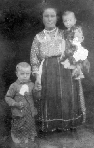 | Keywords: Maria Popiţiu with Iulian (b Aug 15, 1926) & Petre (b June 27, 1929).jpg en Maria Popiţiu with two of her children People from Transylvania ISBN 978-0-9868231-0-7 Author the early 1930s PD-old cc-by-sa-3 0 Black and white photographs of families Looking at viewer Black and white photographic portraits Adults with children Children's clothing Clothing of Romania Black and white portrait photographs at full length People of Transylvania Female black hair Standing children Children of Romania People from Bocșa Sălaj Child carrying Romania in the 1930s People with aprons Barefoot Black and white photographs of standing females |