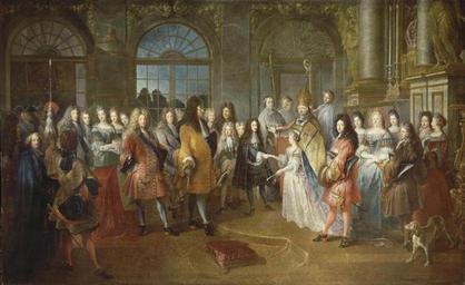| Keywords: Mariage de Louis de France, duc de Bourgogne.jpg  Mariage de Louis de France duc de Bourgogne et de Marie-Adélaïde de Savoie célébré le 7 décembre 1697 par le cardinal de Coislin huile sur toile 1715 carton de tapisserie commandé par Louis XIV pour la manufacture royale des Gobelins en 1710 pour la tenture de l'histoire du roi RMNhttp //www photo rmn fr/LowRes2/TR1/6F2NR9/81-000193 jpg 1715 Antoine Dieu French c 1662-1727 PD-old-100 Oil paintings of people Tapestry cartoons Christian wedding in art Wedding ceremonies in France Former chapels of the Palace of Versailles Louis XIV of France in paintings Marie Adélaïde of Savoy Élisabeth Charlotte d'Orléans Louis Duke of Burgundy Louis Grand Dauphin Elisabeth Charlotte of the Palatinate Louise Françoise de Bourbon Paintings of Philip V of Spain Louise Bénédicte de Bourbon Marie Thérèse de Bourbon Children in art Arranged marriage Louis Alexandre Count of Toulouse Brides and grooms in art 1697 1715 paintings 1690s fashion Events in Versailles Antoine Dieu Pierre du Cambout de Coislin Royal wedding celebrations Philippe Duke of Orléans Regent of France Philip V of Spain while Duke of Anjou Françoise Marie de Bourbon 1697 weddings The marriage of the Duke of Burgundy to Marie Adelaïde of Savoy on December 7 1697 by Antoine Dieu |