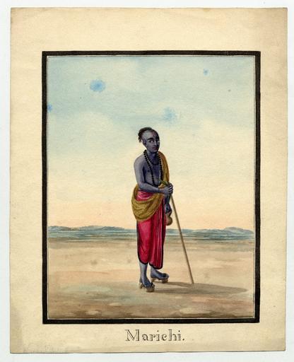 Keywords: Marichi, a Rishi and son of Brahma..jpg en Watercolour painting on paper of Marichi a Rishi and son of Brahma He is shown standing in a flat landscape He wears a red dhoti with a gold shawl tied over his chest He wears wooden sandals and holds a walking stick in his right hand In his left hand he holds a pot A long string of beads hangs around his neck and his head is shaved except for a tuft at the back The painting is surrounded by a black border 19thC early http //www britishmuseum org/research/search_the_collection_database/search_object_details aspx objectid 182817 partid 1 searchText marichi fromADBC ad toADBC ad numpages 10 images on orig 2fresearch 2fsearch_the_collection_database aspx currentPage 1 Company School PD-Art Uploaded with UploadWizard Hindu sages Marichi |