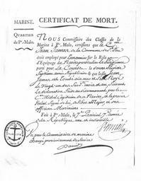 | Keywords: Marine France certificat de mort.jpg fr Attestation de la mort en mer d'un matelot corsaire le 21 pluviôse an 7 par le commissaire des classes de la marine à Saint-Malo Cote 4 S 42 Archives départementales d'Ille-et-Vilaine - Sous-série 4 S TigH 2010 Documents of the French Army Archives in France |