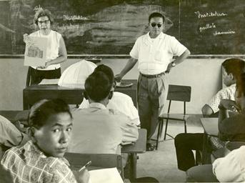 | Keywords: international voluntary services internationalvoluntaryservices voluntary service voluntaryservice marion carnes marioncarnes khamsenh lecture teaching monochrome Caption: 1962. Marian Carnes giving a health lecture and demonstration with the help of Mr. Khamsenh, our interpreter. Citation: International Voluntary Services Records, 1952-2003. Photographs, Vietnam/Laos, 1959-1962. XI-14 Box 58 Folder 8. Mennonite Church USA Archives - Goshen. Goshen, Indiana. Caption: 1962. Marian Carnes giving a health lecture and demonstration with the help of Mr. Khamsenh, our interpreter. Citation: International Voluntary Services Records, 1952-2003. Photographs, Vietnam/Laos, 1959-1962. XI-14 Box 58 Folder 8. Mennonite Church USA Archives - Goshen. Goshen, Indiana. |
