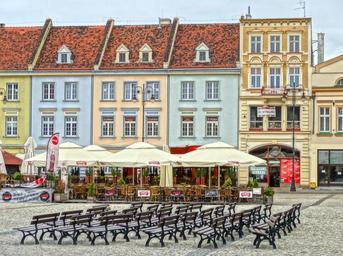 Keywords: market square bydgoszcz poland parasols cafes restaurants buildings historic