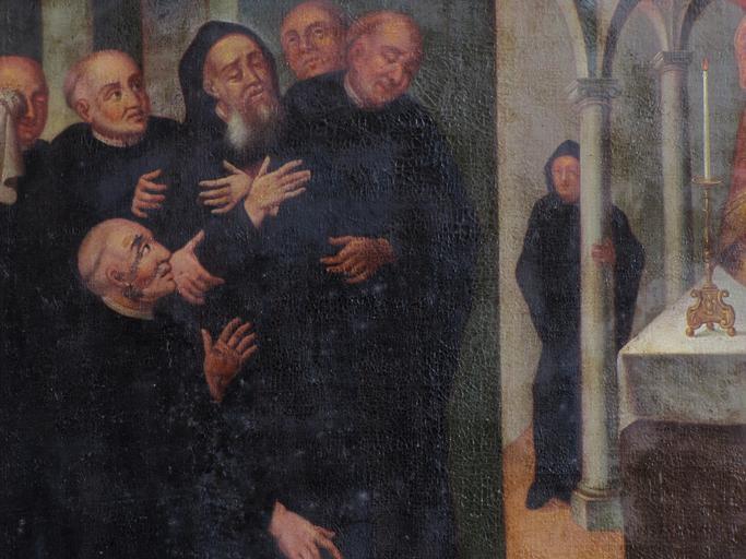 | Keywords: Marmoutier Abbaye 218.JPG  Alsace Bas-Rhin Marmoutier Église abbatiale Saint-Etienne Autel St-Benoît Détails du tableau Mort de St-Benoît XVIIIe own 2013 Ralph Hammann cc-by-sa-3 0 Artwork / Œuvre d'art / Kunstwerk Artist Mort de saint Benoît dans une église à colonnes le saint debout entouré de ses frères exhale son dernier soupir Son âme sous la forme d'un petit personnage blanc est accueillie par Dieu dans les nuées Devant l'autel sont posées une crosse et une mitre circa 1730 oil canvas 110 cm de large Abbatiale Saint-Etienne Marmoutier Autel secondaire de Saint-Benoît IM67011788 object history other versions Ralph Hammann PD-old accession number Photographs of Marmoutier by Ralph Hammann Taken with Canon PowerShot SX20 IS Autel de Saint-Benoît Marmoutier Baroque church paintings in Alsace 18th-century church paintings in Alsace Objets monuments historiques in Bas-Rhin church paintings Paintings of Benedict of Nursia Details of 18th-century paintings |