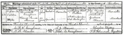 View Original: | Marriage certificate of Florence Annie Strauss and Charles Augustus Vansittart Conybeare.PNG (1098x318) | |||