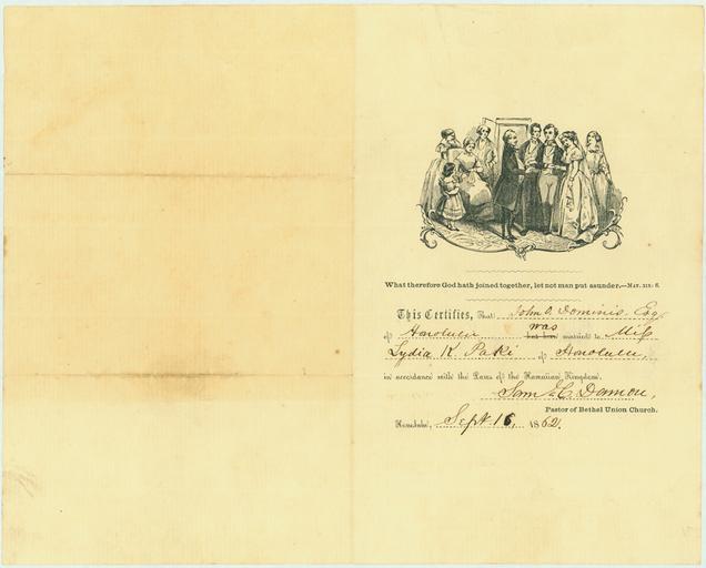 Keywords: Marriage Certificate of John Owen Dominis and Lydia K. Paki.jpg en Marriage Certificate of John Owen Dominis and Lydia K Paki 16 September 1862 http //nutfieldgenealogy blogspot com/2010/12/wedding-wednesday-another-royal-wedding html; Bishop Museum Archives Kingdom of Hawaii 1862-09-16 PD-old-100 John Owen Dominis Liliuokalani Marriage certificates