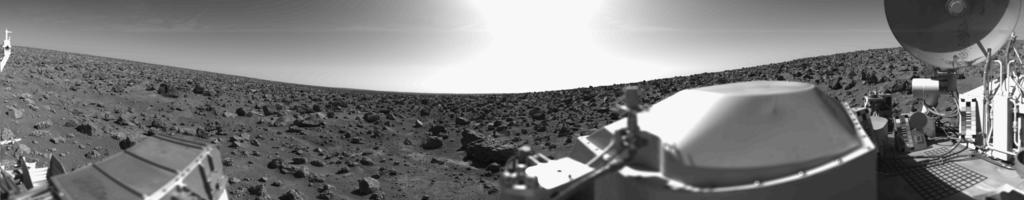 | Keywords: Mars Viking 22a002.png en Original Caption Released with NASA Image <br /> This rocky panoramic scene is the second picture of the Martian surface that was taken by Viking Lander 2 shortly after touchdown on September 3 at 3 58 PM PDT Earth received time The site is on a northern plain of Mars at about 48 N Lat 226 W Long known as Utopia Planitia The picture sweeps around 330 degrees in azimuth starting from northwest at the left through north above the sampler arm housing past east where the sky is bright at the center and southeast toward the right above the radioisotope thermoelectric generator cover The surface is strewn with rocks out to the horizon ranging in size up to several meters across Some pitted rocks resemble fragments of porous volcanic lava Other rocks have grooves that may have been eroded by windblown sand and dust Although fine-grained material is seen between the boulders no sand dunes are evident The dip in the eastern horizon at the center is an illusion caused by an 8-degree tilt of the Lander toward the west Actually the terrain is more level than that at the Viking 1 site The horizon toward the left of the panorama northwest appears featureless indicating that it may be several kilometers distant The sky at the center east is bright because the sun was above but out of the picture at 10 AM Mars time Toward the right southeast the rocks that are silhouetted against the skyline indicate that the horizon is much nearer probably because of a slight rise in that area of the terrain The circular high-gain antenna at the right has clots of fine-grained material adhering to the lower half some of which appeared to have been sliding downward while the camera was scanning the area At the extreme right the banded appearance resulted because the camera continued to scan while it was no longer moving in azimuth Any motion or other variation in the scene would show up as a change in successive lines Own work based on images in the http //pds-geosciences wustl edu/geo/vl1_vl2-m-lcs-2-edr-v1/vl_0002/ NASA Viking image archive Roel van der Hoorn Van der Hoorn 2010-02-17; original photo was taken 1977-09-03 I used the original http //pds-geosciences wustl edu/geo/vl1_vl2-m-lcs-2-edr-v1/vl_0002/a0xx/22a002 sur 22a002 sur image from the http //pds-geosciences wustl edu/geo/vl1_vl2-m-lcs-2-edr-v1/vl_0002/a0xx/ NASA Viking image archive converted it to png and manually removed the noise Except for the conversion this was done in Adobe Photoshop CS2 and Adobe Photoshop CS4 The original file by NASA is in the public domain and so is this new one I created this image as a replacement for the File Vl2 jpg This file was created by NASA but the quality is not very high especially on the right side Using the original pictures from the Lander archive resulted in a higher quality image Van der Hoorn The image is based on an original image from NASA to which the following copyright statement is applicable PD-USGov-NASA Mars landscapes Viking mission Utopia Planitia |