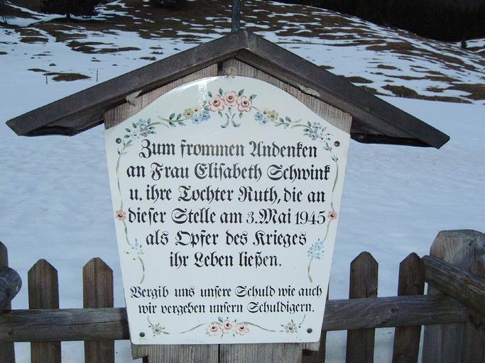 Keywords: Marterl bei Sachenbach zur Erinnerung an den Tod von Elisabeth und Ruth Schwink.jpg Marterl bei Sachenbach zur Erinnerung an den Tod von Elisabeth und Ruth Schwink am 3 Mai 1945 own <br /> de wikipedia Sebastian Wallroth CommonsHelper <br/> original text 1 selbst fotografiert 2002-10 JostGudelius JostGudehus original upload log page de wikipedia 030545Sachenbach jpg 2009-10-14 15 27 JostGudelius 1600×1200× 434000 bytes <nowiki> Andere Versionen </nowiki> ImageNote 1 400 442 698 628 1600 1200 2 <poem>Zum frommen Andenken an Frau Elisabeth Schwink u ihre Tochter Ruth die an dieser Stelle am 3 Mai 1945 als Opfer des Krieges ihr Leben ließen Vergib uns unsere Schuld wie auch wir vergeben unseren Schuldigern </poem> ImageNoteEnd 1 Sachenbach |