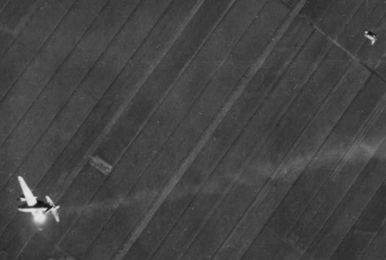 | Keywords: b-26 marauder b26marauder 9th air force 9thairforce world war ii worldwarii usaaf blackandwhite monochrome abstract black and white "Jake's Jerks" (WT-Q) Martin B-26C-15-MO Marauder s/n 41-34963 456th Bomb Squadron, 323rd Bomb Group, 9th Air Force A B-26 Marauder crashes with a burning engine during a raid on Amsterdam-Schipol airdrome, Holland, 13 November 1943. Entire crew of 7 were KIA. MACR 1491 Hit by flak, this 8th (later 9th) Air Force Marauder has had one wing shot away, and tailing smoke from the burning remains of the wing, plunges towards the earth. It was the only Marauder lost in the raid on the Amsterdam-Schipol airdrome, Holland. Note the plane's severed engine at top-right of photo. (U.S. Air Force Photo) "Jake's Jerks" (WT-Q) Martin B-26C-15-MO Marauder s/n 41-34963 456th Bomb Squadron, 323rd Bomb Group, 9th Air Force A B-26 Marauder crashes with a burning engine during a raid on Amsterdam-Schipol airdrome, Holland, 13 November 1943. Entire crew of 7 were KIA. MACR 1491 Hit by flak, this 8th (later 9th) Air Force Marauder has had one wing shot away, and tailing smoke from the burning remains of the wing, plunges towards the earth. It was the only Marauder lost in the raid on the Amsterdam-Schipol airdrome, Holland. Note the plane's severed engine at top-right of photo. (U.S. Air Force Photo) |