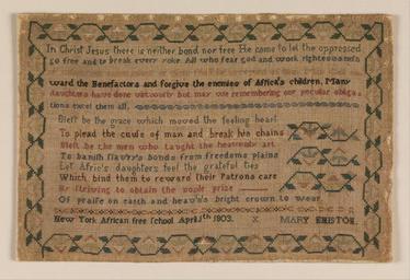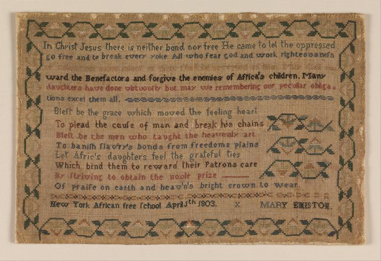 Keywords: Mary Emiston - Sampler - Google Art Project.jpg Mary 6835397 Emiston /collection/cooper-hewitt-national-design-museum/artwork/sampler-mary-emiston/6848396/ 177134 Mary Emiston /artist/mary-emiston/12699337/ 12699337 /collection/cooper-hewitt-national-design-museum/ Cooper-Hewitt National Design Museum 3644669 http //www cooperhewitt org/ /collection/cooper-hewitt-national-design-museum/artwork/sampler-mary-emiston/6848396/ 1803 1803 Medium silk embroidery on linen foundationTechnique embroidered in cross stitch on plain weave foundation By 1962 Phyllis Gordon Montreal 1962 - 1981 Gertrude M Oppenheimer1981 Cooper-Hewitt Museum 280 6848396 False 1803 1981-28-77 http //collection cooperhewitt org/view/objects/asitem/id/177134 Bequest of Gertrude M Oppenheimer Sampler 1800 1810 w425 x h280 cm 1803 False 1 45868945868946 Object sampler-mary-emiston Sampler s 425 H x W 28 x 42 5cm 11 x 16 3/4 in New York African Free School April 5th 1803 Mary Emiston Medium silk embroidery on linen foundationTechnique embroidered in cross stitch on plain weave foundation By 1962 Phyllis Gordon Montreal 1962 - 1981 Gertrude M Oppenheimer1981 Cooper-Hewitt Museum special url_id tgGe1bnQ-XS0Ww PD-old-100-1923 Google Art Project works by Mary Emiston Textiles in the Cooper “Hewitt Smithsonian Design Museum 1800s samplers Google Art Project works in Cooper-Hewitt Smithsonian Design Museum 1803 works