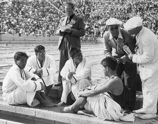 Keywords: Masanori Yusa, Masaharu Taguchi, Shigeo Sugiura and Shigeo Arai 1936.jpg Masanori Yusa Masaharu Taguchi Shigeo Sugiura and Shigeo Arai of Japan are interviewed after winning the gold medal in the Swimming Men's 4x200m Freestyle Relay during the Berlin Olympic at Swimming Stadium on August 11 1936 in Berlin Germany http //www gettyimages co uk/detail/news-photo/masanori-yusa-masaharu-taguchi-shigeo-sugiura-and-shigeo-news-photo/462707562 1936-08-11 Unknown Asahi Shinbun PD-Japan-oldphoto Masanori Yusa Masaharu Taguchi Shigeo Sugiura Shigeo Arai |