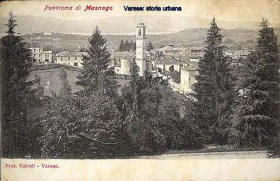 Keywords: Panorama sul centro di Masnago (e in secondo piano sulla sinistra il piccolo borgo di Calcinate degli Origoni - all'epoca frazione del comune di Lissago - e il lago) con la vecchia chiesa dei SS. Pietro e Paolo poi completamente sostituita. Immagine ripresa probabilmente dalla villa Nonaro. varese masnago |