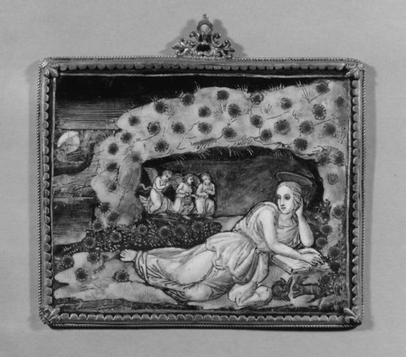 Keywords: Master KIP - Plaque with the Penitent St Mary Magdalen - Walters 44306.jpg The saint lying at the entrance to her cave reclines toward the right her head supported on her left hand Her right arm rests upon an open Bible Behind her three angels are kneeling in the cave of Sainte-Baume and the Mediterranean stretches beyond The rocky ledge and the ground are strewn with gilt plants bearing daisy-like circular flowers with gilt petals around a blue core over paillettes of foil Two rabbits play in the foreground The source of the design was probably a print after the painting of the Magdalene executed around 1520 by Correggio of which there is a copy in the Dresden Museum The pose shows the indirect influence of the Italian iconography of Melancholy represented as a reclining female nude cf Walters 54 214 Despite the similarities in proportions and technique or this plaque to Walters 44 305 the two works were not executed as companion pieces Both however were framed at the same time in their matching gilt-metal frames of the 16th or 17th century showing fleurs-de-lys at the four corners middle Other date century 16 technique painted enamel copper cm 9 5 11 3 accession number 44 306 23400 Samésange Collection Dreux France date and mode of acquisition unknown A von Lanna Collection Prague date and mode of acquisition unknown A von Lanna Sale Berlin November 9 1909 no 72 George Robinson Harding London 1909 by purchase Henry Walters city Baltimore Walters Art Museum Henry Walters Acquired by Henry Walters 1911 place of origin Limoges France Walters Art Museum license Limoges painted enamels in the Walters Art Museum Master KIP Media contributed by the Walters Art Museum needs category review Painted enamel art in the Walters Art Museum |