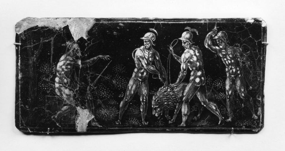 Keywords: Master of the Mars and Venus Plaque - Sacrifice of a Lion - Walters 4450.jpg Two nude bearded men wearing helmets and followed by a third helmeted warrior bearing a shield lead a lion secured by a double leash before a nude man Mars who sits on a rock to the left and is armed with a sword Shrubs and bushes are scattered in the background The plaque could have been inset in a casket which no longer exists ca 1535 1540 late Renaissance technique painted enamel copper cm 7 2 15 6 accession number 44 50 23114 Thewalt Collection Sale Cologne November 14 1903 lot 993 Jacques Seligmann Paris date of acquisition unknown by purchase Henry Walters city Baltimore Walters Art Museum Henry Walters Acquired by Henry Walters 1906 place of origin Limoges France Walters Art Museum license Limoges painted enamels in the Walters Art Museum Master of the Mars and Venus Plaque Media contributed by the Walters Art Museum needs category review Painted enamel art in the Walters Art Museum Mars god Animal sacrifice in art |