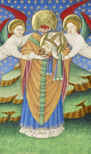 Keywords: Master of Sir John Fastolf, Saint Denis Holding His Head - Getty Museum.jpg Saint Denis the first bishop of Paris was beheaded in that city in the year 250 According to legend angels accompanied him as he carried his own head from the place of execution to his chosen burial site where later the church of Saint Denis was built just outside of Paris Dressed in his bishop's garments the saint is depicted with two haloes--one behind his decapitated head and a second behind the stump of his neck This feature reflects medieval notions about the incorruptibility of saintly remains--the body does not decompose after death <br> By including two haloes the artist emphasizes Saint Denis's presence in each part of his body and the sanctity of his physical remains circa 1430 1440 Tempera colors gold leaf and ink on parchment Leaf 12 1 x 9 2 cm 4 3/4 x 3 5/8 in Institution Getty Museum object history exhibition history other versions 3006 credit line accession number 84 ML 723 35v PD-100 Denis de Paris in miniatures Halo religious iconography MS 5 Getty museum - Book of Hours by Master of Sir John Fastolf |