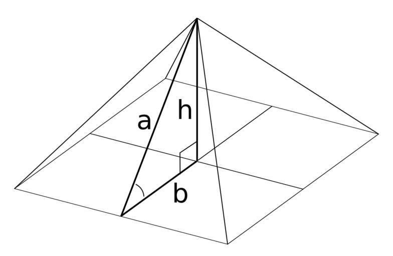 | Keywords: Mathematical Pyramid.svg Regular square pyramid showing the median triangle with apothem a semi-base b height h and inclination angle own 2006-09-21 Dicklyon wikipedia en Dicklyon Original upload log en wikipedia C messier CommonsHelper en wikipedia Mathematical+Pyramid svg 2006-09-21 21 56 Dicklyon 480×314× 8530 bytes <nowiki>Updated pyramid a little taller tighter framing showing right angle </nowiki> 2006-09-21 02 46 Dicklyon 501×325× 8015 bytes <nowiki>Regular square pyramid showing the median triangle with apothem a semi-base b height h and inclination angle </nowiki> Pyramids geometry Golden ratio in pyramids |