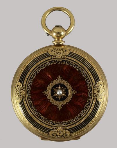 | Keywords: Mathey Peytieu - Ladies Hunting Case Watch - Walters 58287 - Back.jpg An 18K gold case with translucent enamel over guilloché surface revealing engraved patterns Enameled in the face of the case is a putto with flowers and on the reverse is finely engraved gold ground covered with brown transluscent enamel and set with a half-pearl between 1840 1849 gold translucent enamel over guilloché surface rose diamonds rubies half-pearl Diam 1 11/16 x D 3/8 in 4 29 x 0 95 cm accession number 58 287 35509 Rebecca Ulman Weil date of acquisition unknown by purchase Henrietta Lehmayer Moser 1898-1960 Baltimore 1936 by inheritance from her aunt Liz and Peter Moser Baltimore 1958-1959 by gift from his mother Walters Art Museum Gift of Liz and Peter Moser 2006 place of origin Le Locle Switzerland Walters Art Museum license Media contributed by the Walters Art Museum needs category review Timepieces in the Walters Art Museum Media contributed by the Walters Art Museum needs artist review Pocket watches Guilloché |