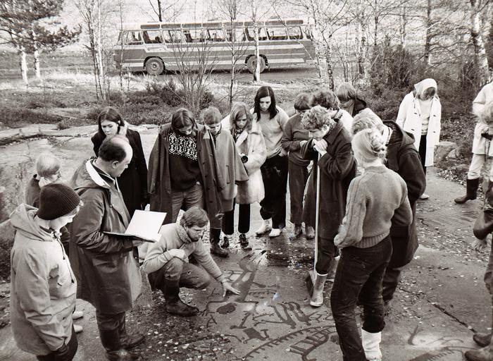 Keywords: Mats P Malmer 2.jpg sv Professor Mats P Malmer med pärmen med arkeologstudenter på Skomakarhällen Raä-nr Brastad 1 1 i Bohuslän 1970 own Sven Rosborn 1970 10153900010001 RAÄ-nr Brastad 1 1 1970 Skomakarhällen