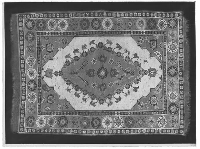 Keywords: Matta från ushak-området, s.k. Siebenburgermatta - Skoklosters slott - 68763-negative.tif LSH artwork sv I mittfältet blommor bl a tulpaner sammanställda i en romb i gult blått och grönt mot röd botten avtecknande sig mot ett mörkblått fält <br/>I hörnfälten närmast bården blommor och symboliska figurer mot röd botten <br/>Bård med rosetter i gult vitt blått grönt och svart mot röd botten <br/>På kortsidorna smalt avslutningsparti i gult utan knutar <br/>Ghiordesknutar <br/>Turkiet Ushak 1600- talet original caption century 17 size mm 1060 1540 SKO Dröm och verklighet - Orienten på Skokloster 2001 Skoklosters slott Transylvania and the Art of Ottoman Turkish Carpets Ny prel tid 2015 Budapest Museum of Applied Arts place of origin original filename LN_A02778_002778 23083 inventory number SKO 1835 68763 CC0 Matta från ushak-området s k Siebenburgermatta - Skoklosters slott - 68763 tif Uncategorized 2015 March 5 |