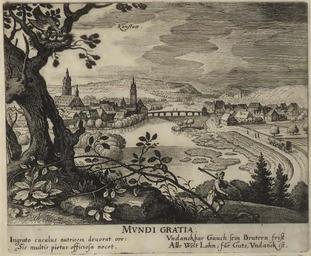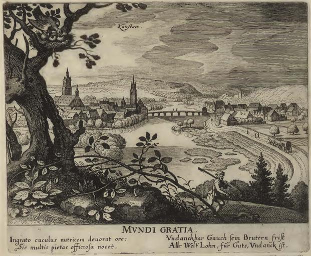 | Keywords: Matthäus Merian, Stuttgart, 015.jpg  de žKanstatt Emblem mit Kuckuck und Ansicht von Cannstatt Radierung von Matthäus Merian 1624 120 x 164 mm Schefold 8788 Novae regionum aliquot amaenissimarum delineationes Ex naturali locorum Positu de sumptae et aeri incisae Per Mattheum Merianum Basiliensem Anno 1624 Peter Aubry Excudit Argent Straßburg Aubry 1624 https //ia800203 us archive org/19/items/gri_33125005968249/gri_33125005968249 pdf online Matthäus Merian 1624 Blick von Nordosten auf den Neckar und die Neckarbrücke zu beiden Seiten Cannstatt links die Stadtkirche und am Ufer der Brückenturm mit dem Neckartor Vorn links räubert auf einem verkrüppelten Baum ein Kuckuck im Nest seines Brutwirts Rechts davon ein querliegender Dornstrauch und ein Jäger mit Hund Im Hintergrund rechts das Dorf Berg mit der Berger Kirche Der undankbare Gauch Kuckuck der im Nest seines Brutwirts räubert illustriert den Sinnspruch žMundi gratia žUndank ist der Welt Lohn PD-old-100 Historic views of Stuttgart Matthäus Merian ™s Engravings of Stuttgart Stuttgart-Bad Cannstatt Neckar in art |