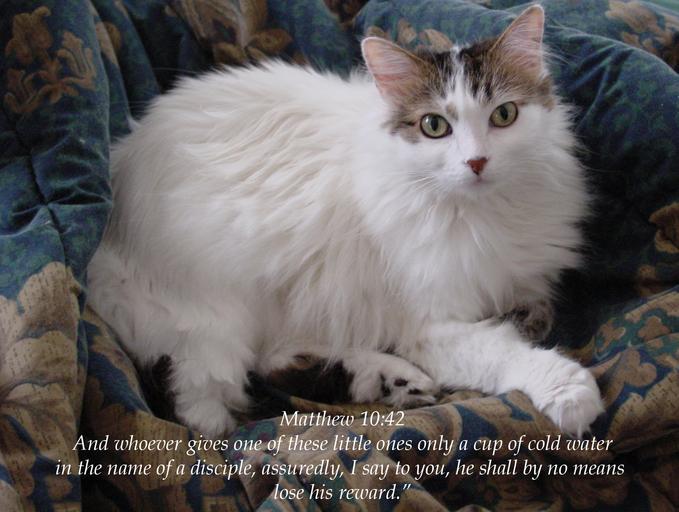 Keywords: god jesus jesus christ jesuschrist god the father godthefather holy spirit holyspirit holy church scripture angels faith prayer pray hope peace love alive forevermore aliveforevermore angel christian righteous king of kings kingofkings heaven archangel god is love godislove prince of peace princeofpeace creator christ the creator christthecreator god the creator godthecreator third heaven thirdheaven awesome alpha and omega alphaandomega wonderful glorious omnipotent almighty bible holy bible holybible armor of god armorofgod glorify hallelujah judgment judgment day judgmentday usa united states of america unitedstatesofamerica cats cat cold water coldwater little one littleone word of god wordofgod the lord is my shepherd thelordismyshepherd eternity confess repent repentance humble sinner humble yourself humbleyourself saved lost found salvation praise god praisegod amen word became flesh wordbecameflesh be strong bestrong courage spiritual warfare animal pet indoor New King James Version (NKJV)0 And whoever gives one of these little ones only a cup of cold water in the name of a disciple, assuredly, I say to you, he shall by no means lose his reward.” Romans 8:28 New King James Version (NKJV) And we know that all things work together for good to those who love God, to those who are the called according to His purpose. New King James Version (NKJV)0 And whoever gives one of these little ones only a cup of cold water in the name of a disciple, assuredly, I say to you, he shall by no means lose his reward.” Romans 8:28 New King James Version (NKJV) And we know that all things work together for good to those who love God, to those who are the called according to His purpose. |