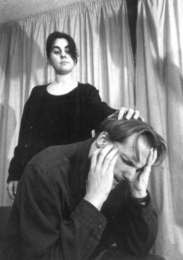 Keywords: Matthew Cox and Suzanne Rudd.jpg Exiled Theatre Exiled Theatre's first production of the play Some God Some Angel Some Devil Own Hambert ca 2004-01 2004-09 – 2008-10-09 Black and white photographs of women and men Plays Hands on head