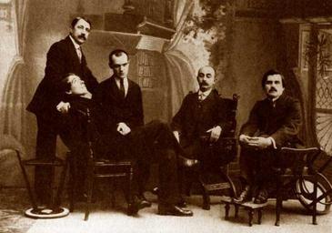 | Keywords: Matyushin, Kruchenykh, Filonov, Shkolnik, Malevich.jpg слева нап аво атюшин А К учёных П Филонов И Школьник К алевич http //www ka2 ru/nauka/figures html 1913 масте ская К Буллы PD-old Photographs by Karl Bulla Kazimir Malevich Pavel Filonov Aleksei Kruchenykh Files uploaded by Shakko from various sources |