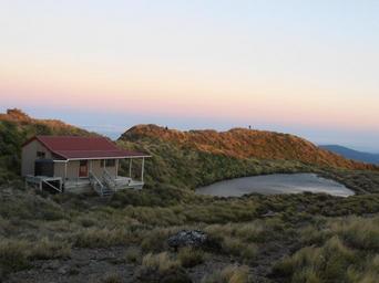 Keywords: Maungahuka Hut 3.jpg The Maungahuka hut at sunrise amidst tussock grass own 2013-02-20 Sarang Maungahuka Hut