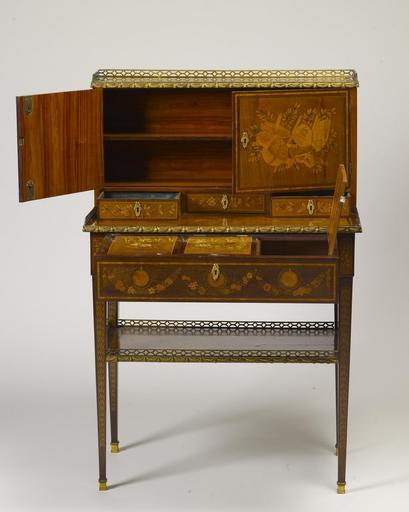 Keywords: Maurice-Bernard Evalde - Lady's Desk - Walters 6560 - Front View D.jpg This desk bears the stamp of Evalde who became a master ébéniste or maker of inlaid furniture in 1765 He was responsible for the now lost jewel cabinet that King Louis XV of France presented to Marie-Antoinette on the occasion of her marriage to the future Louis XVI in 1770 The key to this desk bears the crown of France indicating that the piece may have been made for a member of the royal family The doors are inlaid in colored marquetry wood inlay Among the images found on the surface are a writing table and navigational instruments The desk's front drawer opens to reveal an inlaid writing surface which slides back to reveal compartments below ca 1770 oak marquetry in naturally colored and stained woods and gilded bronze cm 120 67 ; With drawers open cm 104 14 67 95 65 41 accession number 65 60 9586 La Comtesse Henri du Chastel de la Howarderie Belgium Sale Christies London December 4 1969 lot no 108 Ronald A Lee 1-9 Bruton Place London as agent Walters Art Museum 1969 by purchase Museum purchase in memory of Philip B Perlman 1969 place of origin Paris France Walters Art Museum license Media contributed by the Walters Art Museum needs category review Furniture in the Walters Art Museum Maurice-Bernard Evalde |