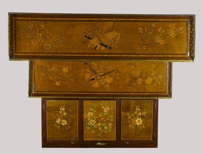 Keywords: Maurice-Bernard Evalde - Lady's Desk - Walters 6560 - Top View A.jpg This desk bears the stamp of Evalde who became a master ébéniste or maker of inlaid furniture in 1765 He was responsible for the now lost jewel cabinet that King Louis XV of France presented to Marie-Antoinette on the occasion of her marriage to the future Louis XVI in 1770 The key to this desk bears the crown of France indicating that the piece may have been made for a member of the royal family The doors are inlaid in colored marquetry wood inlay Among the images found on the surface are a writing table and navigational instruments The desk's front drawer opens to reveal an inlaid writing surface which slides back to reveal compartments below ca 1770 oak marquetry in naturally colored and stained woods and gilded bronze cm 120 67 ; With drawers open cm 104 14 67 95 65 41 accession number 65 60 9586 La Comtesse Henri du Chastel de la Howarderie Belgium Sale Christies London December 4 1969 lot no 108 Ronald A Lee 1-9 Bruton Place London as agent Walters Art Museum 1969 by purchase Museum purchase in memory of Philip B Perlman 1969 place of origin Paris France Walters Art Museum license Maurice-Bernard Evalde Media contributed by the Walters Art Museum needs category review Furniture in the Walters Art Museum |