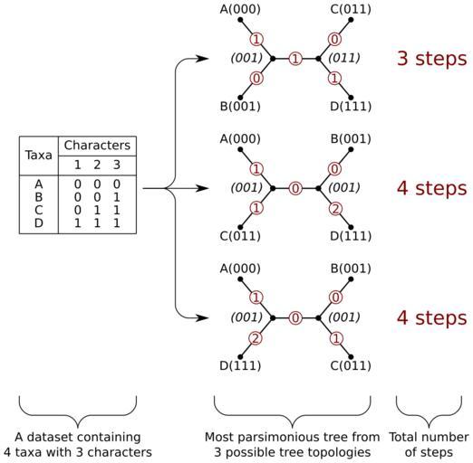 Keywords: Maximal parsimony unroot tree.svg en The idea of maximal parsimony analysis 2013-01-15 20 28 12 own Chen-Pan Liao created with Inkscape cc-zero Uploaded with UploadWizard Phylogenetic trees