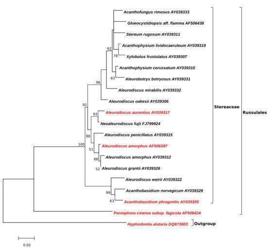 | Keywords: Maximum Likelihood-Tree-Acanthobasidium-Aleurodiscus-Neoaleurodiscus.svg Figure Evolutionary relationships of Acanthobasidium Aleurodiscus s s and Neoaleurodiscus<br/> The evolutionary history was inferred by using the Maximum Likelihood method based on the Tamura-Nei model 1 The tree with the highest log likelihood -3059 7469 is shown The percentage of trees in which the associated taxa clustered together is shown next to the branches Initial tree s for the heuristic search were obtained by applying the Neighbor-Joining method to a matrix of pairwise distances estimated using the Maximum Composite Likelihood MCL approach A discrete Gamma distribution was used to model evolutionary rate differences among sites 5 categories +G parameter 0 1542 The rate variation model allowed for some sites to be evolutionarily invariable +I 54 0453 sites The tree is drawn to scale with branch lengths measured in the number of substitutions per site The analysis involved 20 nucleotide sequences There were a total of 935 positions in the final dataset Evolutionary analyses were conducted in MEGA6 2 <br/> For all taxa the GenBank number of the DNA-sequence is shown All black sequences sequences are used bySheng-Hua Wu in his most parsimonious tree additional sequences are red 3<br/><br/> 1 Tamura K and Nei M 1993 Estimation of the number of nucleotide substitutions in the control region of mitochondrial DNA in humans and chimpanzees Molecular Biology and Evolution 10 512-526 <br/> 2 Tamura K Stecher G Peterson D Filipski A and Kumar S 2013 MEGA6 Molecular Evolutionary Genetics Analysis version 6 0 Molecular Biology and Evolution30 2725-2729 <br/> 3 Sheng-Hua Wu Dong-Mei Wang Shi-Yi Yu Neoaleurodiscus fujii a new genus and new species found at the timberline in Japan In The Mycological Society of America Hrsg Mycologia Vol 102 1 Lawrence 2010 S 217 “223<br/> ; List with GenBank Sequences http //www ncbi nlm nih gov/nuccore/AY039326 Aleurodiscus grantii strain T569 http //www ncbi nlm nih gov/nuccore/AY039312 Aleurodiscus amorphus strain HHB15282 http //www ncbi nlm nih gov/nuccore/AF506397 Aleurodiscus amorphus - AF506397 http //www ncbi nlm nih gov/nuccore/AY039315 Acanthobasicium penicillatum strain T322 http //www ncbi nlm nih gov/nuccore/AY039322 Aleurodiscus weirii strain HHB12678 http //www ncbi nlm nih gov/nuccore/AY039328 Acanthobasidium norvegicum strain T623 http //www ncbi nlm nih gov/nuccore/AY039317 Acanthobasidium aurantius strain T621 http //www ncbi nlm nih gov/nuccore/FJ799924 Neoaleurodiscus fujii strain Wu0807-41 http //www ncbi nlm nih gov/nuccore/AY039333 Acanthofungus rimosus AY039333 http //www ncbi nlm nih gov/nuccore/AY039311 Stereum rugosum AY039311 http //www ncbi nlm nih gov/nuccore/AY039319 Acanthophysium lividocaeruleum AY039319 http //www ncbi nlm nih gov/nuccore/AY039307 Xylobolus frustulatus AY039307 http //www ncbi nlm nih gov/nuccore/AY039310 Acanthophysium cerussatum AY039310 http //www ncbi nlm nih gov/nuccore/AY039331 Aleurobotrys botryosus AY039331 http //www ncbi nlm nih gov/nuccore/AF506438 Gloeocystidiopsis aff flamma AF506438 http //www ncbi nlm nih gov/nuccore/AY039332 Aleurodiscus mirabilis AY039332 http //www ncbi nlm nih gov/nuccore/AY039306 Aleurodiscus oakesii AY039306 http //www ncbi nlm nih gov/nuccore/AF506424 Peniophora cinerea subsp fagicola AF506424 http //www ncbi nlm nih gov/nuccore/AY039305 Acanthobasidium phragmitis AY039305 http //www ncbi nlm nih gov/nuccore/DQ873603 Hyphodontia alutaria DQ873603 own 2014-08-19 Thkgk Cc-zero Acanthobasidium Aleurodiscus penicillatus Aleurodiscus Neoaleurodiscus |