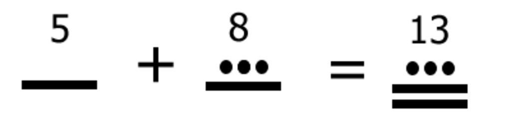 | Keywords: Maya add.png The equation 5 + 8 equal 13 written with Maya numerals Transferred from http //en wikipedia org en wikipedia; transferred to Commons by User Trixt using http //tools wikimedia de/~magnus/commonshelper php CommonsHelper 2006-12-06 Original uploader was Mdsats at http //en wikipedia org en wikipedia Released into the public domain by the author Maya Mathematics Instead of ten digits like we have today the Maya used a base number of 20 Base 20 is vigesimal They also used a system of bar and dot as shorthand for counting A dot stood for one and a bar stood for five In the following table you can see how this works 0 1 2 3 4 5 6 7 8 9 10 11 12 13 14 15 16 17 18 19 Because the base of the number system was 20 larger numbers were written down in powers of 20 We do that in our decimal system too for example 32 is 3×10+2 In the Maya system this would be 1×20+12 because they used 20 as base Numbers were written from bottom to top Below you can see how the number 32 was written 20's 1 1's 12 It was very easy to add and subtract using this number system but they did not use fractions Here's an example of a simple addiMaya Mathematics Instead of ten digits like we have today the Maya used a base number of 20 Base 20 is vigesimal They also used a system of bar and dot as shorthand for counting A dot stood for one and a bar stood for five In the following table you can see how this works 0 1 2 3 4 5 6 7 8 9 10 11 12 13 14 15 16 17 18 19 Because the base of the number system was 20 larger numbers were written down in powers of 20 We do that in our decimal system too for example 32 is 3×10+2 In the Maya system this would be 1×20+12 because they used 20 as base Numbers were written from bottom to top Below you can see how the number 32 was written 20's 1 1's 12 It was very easy to add and subtract using this number system but they did not use fractions Here's an example of a simple addition 8000's 400's 20's + 1's 9449 + 10425 19874 As you can see adding is just a matter of adding up dots and bars Maya merchants often used cocoa beans which they laid out on the ground to do these calculations If you have a Java-enabled browser you will see an interactive number converter below Fill in the a number in the top field and press return to find its Maya equivalent Press +1 and -1 to change the number by one tion 8000's 400's 20's + 1's 9449 + 10425 19874 As you can see adding is just a matter of adding up dots and bars Maya merchants often used cocoa beans which they laid out on the ground to do these calculations If you have a Java-enabled browser you will see an interactive number converter below Fill in the a number in the top field and press return to find its Maya equivalent Press +1 and -1 to change the number by one en wikipedia Mdsats original upload log page en wikipedia Maya_add png 2006-12-06 22 06 Mdsats 400×94× 2865 bytes <nowiki>The equation 5 + 8 13 written with Maya numerals</nowiki> Convert to SVG Maya numerals Decimal numbers |