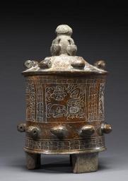 | Keywords: Mayan - Lidded Vessel - Walters 20092039 - Side C.jpg The Classic Maya political landscape was divided into more than two dozen polities similar to city-states composed of a primary site plus aligned towns and villages Each was headed by a royal lineage supported by noble families and the polities often competed against each other for political and economic supremacy Feasts sponsored by the ruling elite provided a crucial platform for securing relations among aligned parties and negotiating new alliances Feasts were integral to elaborate affairs of state from rulers' accession rites to royal weddings to war victory celebrations and special religious observances The consumption of large amounts of sumptuous foods including drinks made from highly valued cacao chocolate was a focal point The banquets prompted the production of finely made food-service wares in the form of pictorial pottery their decorative imagery often featuring themes lauding the earthly or supernatural prowess of the host These ornate vessels also functioned as gifts their acceptance signaling the guests' alliance or at least an association with the host The vase's hieroglyphic text confirms its function as a drinking vessel-kakaw yuk'ib or the cacao drinking cup of The text goes on to name the cup's patron/owner at B2 and his father at d1-d2 Chakjal Mukuuy Reddening Dove Neither of these individuals is known from other Early Classic hieroglyphic texts and thus we do not know their political or familial identities Yet the artistic quality of the vessel and its detailed nominal phrase indicate their being members of the nobility if not a royal dynasty of the fourth-fifth centuries The two hieroglyphic texts are separated by pictorial panels featuring the maize god as an embodied cacao tree His bejeweled headdress is topped by a sprouting cacao tree like those adorning the vase's lid Modeled cacao pods embellish the vessel and the lid's knob is a cacao tree with a bird now broken The avian may be the false sun of the previous creation and avatar of the deity Itz'amnaj God D Uniting text and image panels are overlapping bands of cacao leaves The preponderance of cacao imagery supports the interpretation of the text's unusual introductory glyphs a1-b1 as sprouting cacao based on the first sign's resemblance to the vase's sprouting trees see the Maize god's headdress and its sub-fixed sign -la a well-known adjectival element in Maya hieroglyphic writing AD 250-550 Early Classic earthenware slip with incising cm 34 77 22 86 accession number 2009 20 39 80194 Stendahl Galleries Los Angeles date and mode of acquisition unknown John G Bourne 1970s by purchase Walters Art Museum Gift of John Bourne 2009 place of origin Guatemala Walters Art Museum license Maya art in the Walters Art Museum Maya tripod vessels Media contributed by the Walters Art Museum needs category review Maize god |