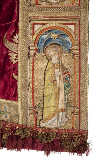 | Keywords: MCC-21485 Rode koorkap met verrijzenis op schild, aurifriezen met Bonifatius, Augustinus en Barbara (7).tif  Artwork nl onbekend nl Koorkap van wijnrood zijdefluweel waarop met gouddraad grote gestyleerde bloemranken en bladeren geappliceerd zijn Op de rugzijde wordt op een koorkapschild onder drie halfronde baldakijnen met gewelven gescheiden door torentjes en in het midden een roosvenster de Verrijzenis van Christus afgebeeld Centraal op het schild staat Christus verrezen uit het graf gehuld in koormantel met agrafe In de linkerhand houdt hij een kruisvaan met de rechter maakt hij een zegenend gebaar Links van de geopende tombe naderen de drie Maria's Maria Magdalena Maria van Betthanië en een niet nader omschreven Maria Luc 7 36 om Christus' lichaam te balsemen Rechts 'Noli me tangere' 'Wil mij niet aanraken' Joh 20 11-19 waarin Maria Magdalena geknield opziet naar Christus die haar verschijnt als hovenier met een spade in de hand Aan weerskanten van het graf bewakers deels slapend; rechts schrikt een soldaat wakker Links op de achtergrond enkele gebouwen rechts een bergachtig Golgotha waarop de drie kruisen nog zichtbaar zijn De aurifriezen aan de voorkant van de mantel zijn van eerder datum ca 1490 Onder eenvoudige gotische baldakijnen worden tegen een gedamasceerde achtergrond in totaal acht heiligen en bisschoppen afgebeeld van wie er slechts drie middels een attribuut kunnen worden geïdentificeerd Op de linkerstrook wordt bovenaan Barbara uitgebeeld Het loshangend haar hangt over de schouders Ze houdt haar attribuut de toren in de rechterhand Onder Barbara in koormantel paus Cornelius met pausstaf in de linkerhand en tiara op het hoofd Zijn attribuut de hoorn houdt hij in de rechterhand Daaronder een bisschop of kerkvader met de staf in de rechterhand In de linker houdt hij een opengeslagen boek Onderaan weer een bisschop met een dicht boek in de rechterhand en een staf in de linkerhand Op de rechterkolom bovenaan een onbekende bisschop gevolgd door een bisschop die onder de koormantel een maliënkolder draagt Ansfridus Aan zijn voeten een wapenschildmet afwisselend rode en gouden stroken Daaronder de kerkvader Augustinus met zijn attribuut een hart in de linkerhand Rechts houdt hij de bisschopsstaf Onderaan een vierde bisschop of kerkvader die met beide handen een open boek vasthoudt Techniek het opmerkelijke van het weefsel is dat de motieven niet in de stof geweven zijn De gouddraden zijn eerst op een rode katoenen ondergrond gelegd en gehecht en later op het fluweel geappliceerd niet opgehoogd In het borduurwerk op het schild is voor de mantel van Christus en overige kleding de lazuurtechniek toegepast In de architectuur en achtergrond is gebruik gemaakt van deels opgehoogd gehecht en gelegd gouddraad De lichaamspartijen en het graslandschap zijn met zijde in de ingrijpsteek aangebracht De achtergrond van de figuren aan de voorkant van de koorkap is van gelegd en in blokjesmotief gehecht gouddraad Ook in de attributen en de architectuur is gebruik gemaakt van gouddraad De gezichten handen en mantels zijn van zijde in ingrijpsteek De tegelvloertjes zijn van gelegde en met gouddraad gehechte zijde Staat het zijdeborduuwerk aan de voorkant is hier en daar versleten; de gouden draden hangen deels los Staat een deel van de gelegde en met zijde gehechte gouddraden van de applicaties op het weefsel zijn losgeraakt Ook in het borduurwerk zitten enkele losse draden De zoom van de groen zijden voering is voor een groot deel versleten De franje onder aan de koorkap is uit later tijd 17de eeuw between 1490 1519 nl fluweel zijde gouddraad Size 148 322 cm Institution Museum Catharijneconvent place of discovery object history exhibition history credit line nl Foto Museum Catharijneconvent Utrecht foto Ruben de Heer accession number Object number 21485 Inventory number BMH t622 place of creation nl Zuid-Nederland https //www catharijneconvent nl/adlib/21485/ View this work on the website of Museum Catharijneconvent Museum Catharijneconvent Cc-zero Textiles in the Museum Catharijneconvent Media contributed by Museum Catharijneconvent Uploaded with pattypan |