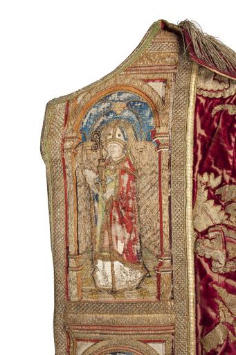 | Keywords: MCC-21485 Rode koorkap met verrijzenis op schild, aurifriezen met Bonifatius, Augustinus en Barbara (8).tif  Artwork nl onbekend nl Koorkap van wijnrood zijdefluweel waarop met gouddraad grote gestyleerde bloemranken en bladeren geappliceerd zijn Op de rugzijde wordt op een koorkapschild onder drie halfronde baldakijnen met gewelven gescheiden door torentjes en in het midden een roosvenster de Verrijzenis van Christus afgebeeld Centraal op het schild staat Christus verrezen uit het graf gehuld in koormantel met agrafe In de linkerhand houdt hij een kruisvaan met de rechter maakt hij een zegenend gebaar Links van de geopende tombe naderen de drie Maria's Maria Magdalena Maria van Betthanië en een niet nader omschreven Maria Luc 7 36 om Christus' lichaam te balsemen Rechts 'Noli me tangere' 'Wil mij niet aanraken' Joh 20 11-19 waarin Maria Magdalena geknield opziet naar Christus die haar verschijnt als hovenier met een spade in de hand Aan weerskanten van het graf bewakers deels slapend; rechts schrikt een soldaat wakker Links op de achtergrond enkele gebouwen rechts een bergachtig Golgotha waarop de drie kruisen nog zichtbaar zijn De aurifriezen aan de voorkant van de mantel zijn van eerder datum ca 1490 Onder eenvoudige gotische baldakijnen worden tegen een gedamasceerde achtergrond in totaal acht heiligen en bisschoppen afgebeeld van wie er slechts drie middels een attribuut kunnen worden geïdentificeerd Op de linkerstrook wordt bovenaan Barbara uitgebeeld Het loshangend haar hangt over de schouders Ze houdt haar attribuut de toren in de rechterhand Onder Barbara in koormantel paus Cornelius met pausstaf in de linkerhand en tiara op het hoofd Zijn attribuut de hoorn houdt hij in de rechterhand Daaronder een bisschop of kerkvader met de staf in de rechterhand In de linker houdt hij een opengeslagen boek Onderaan weer een bisschop met een dicht boek in de rechterhand en een staf in de linkerhand Op de rechterkolom bovenaan een onbekende bisschop gevolgd door een bisschop die onder de koormantel een maliënkolder draagt Ansfridus Aan zijn voeten een wapenschildmet afwisselend rode en gouden stroken Daaronder de kerkvader Augustinus met zijn attribuut een hart in de linkerhand Rechts houdt hij de bisschopsstaf Onderaan een vierde bisschop of kerkvader die met beide handen een open boek vasthoudt Techniek het opmerkelijke van het weefsel is dat de motieven niet in de stof geweven zijn De gouddraden zijn eerst op een rode katoenen ondergrond gelegd en gehecht en later op het fluweel geappliceerd niet opgehoogd In het borduurwerk op het schild is voor de mantel van Christus en overige kleding de lazuurtechniek toegepast In de architectuur en achtergrond is gebruik gemaakt van deels opgehoogd gehecht en gelegd gouddraad De lichaamspartijen en het graslandschap zijn met zijde in de ingrijpsteek aangebracht De achtergrond van de figuren aan de voorkant van de koorkap is van gelegd en in blokjesmotief gehecht gouddraad Ook in de attributen en de architectuur is gebruik gemaakt van gouddraad De gezichten handen en mantels zijn van zijde in ingrijpsteek De tegelvloertjes zijn van gelegde en met gouddraad gehechte zijde Staat het zijdeborduuwerk aan de voorkant is hier en daar versleten; de gouden draden hangen deels los Staat een deel van de gelegde en met zijde gehechte gouddraden van de applicaties op het weefsel zijn losgeraakt Ook in het borduurwerk zitten enkele losse draden De zoom van de groen zijden voering is voor een groot deel versleten De franje onder aan de koorkap is uit later tijd 17de eeuw between 1490 1519 nl fluweel zijde gouddraad Size 148 322 cm Institution Museum Catharijneconvent place of discovery object history exhibition history credit line nl Foto Museum Catharijneconvent Utrecht foto Ruben de Heer accession number Object number 21485 Inventory number BMH t622 place of creation nl Zuid-Nederland https //www catharijneconvent nl/adlib/21485/ View this work on the website of Museum Catharijneconvent Museum Catharijneconvent Cc-zero Textiles in the Museum Catharijneconvent Media contributed by Museum Catharijneconvent Uploaded with pattypan |