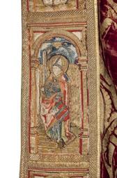 | Keywords: MCC-21485 Rode koorkap met verrijzenis op schild, aurifriezen met Bonifatius, Augustinus en Barbara (9).tif  Artwork nl onbekend nl Koorkap van wijnrood zijdefluweel waarop met gouddraad grote gestyleerde bloemranken en bladeren geappliceerd zijn Op de rugzijde wordt op een koorkapschild onder drie halfronde baldakijnen met gewelven gescheiden door torentjes en in het midden een roosvenster de Verrijzenis van Christus afgebeeld Centraal op het schild staat Christus verrezen uit het graf gehuld in koormantel met agrafe In de linkerhand houdt hij een kruisvaan met de rechter maakt hij een zegenend gebaar Links van de geopende tombe naderen de drie Maria's Maria Magdalena Maria van Betthanië en een niet nader omschreven Maria Luc 7 36 om Christus' lichaam te balsemen Rechts 'Noli me tangere' 'Wil mij niet aanraken' Joh 20 11-19 waarin Maria Magdalena geknield opziet naar Christus die haar verschijnt als hovenier met een spade in de hand Aan weerskanten van het graf bewakers deels slapend; rechts schrikt een soldaat wakker Links op de achtergrond enkele gebouwen rechts een bergachtig Golgotha waarop de drie kruisen nog zichtbaar zijn De aurifriezen aan de voorkant van de mantel zijn van eerder datum ca 1490 Onder eenvoudige gotische baldakijnen worden tegen een gedamasceerde achtergrond in totaal acht heiligen en bisschoppen afgebeeld van wie er slechts drie middels een attribuut kunnen worden geïdentificeerd Op de linkerstrook wordt bovenaan Barbara uitgebeeld Het loshangend haar hangt over de schouders Ze houdt haar attribuut de toren in de rechterhand Onder Barbara in koormantel paus Cornelius met pausstaf in de linkerhand en tiara op het hoofd Zijn attribuut de hoorn houdt hij in de rechterhand Daaronder een bisschop of kerkvader met de staf in de rechterhand In de linker houdt hij een opengeslagen boek Onderaan weer een bisschop met een dicht boek in de rechterhand en een staf in de linkerhand Op de rechterkolom bovenaan een onbekende bisschop gevolgd door een bisschop die onder de koormantel een maliënkolder draagt Ansfridus Aan zijn voeten een wapenschildmet afwisselend rode en gouden stroken Daaronder de kerkvader Augustinus met zijn attribuut een hart in de linkerhand Rechts houdt hij de bisschopsstaf Onderaan een vierde bisschop of kerkvader die met beide handen een open boek vasthoudt Techniek het opmerkelijke van het weefsel is dat de motieven niet in de stof geweven zijn De gouddraden zijn eerst op een rode katoenen ondergrond gelegd en gehecht en later op het fluweel geappliceerd niet opgehoogd In het borduurwerk op het schild is voor de mantel van Christus en overige kleding de lazuurtechniek toegepast In de architectuur en achtergrond is gebruik gemaakt van deels opgehoogd gehecht en gelegd gouddraad De lichaamspartijen en het graslandschap zijn met zijde in de ingrijpsteek aangebracht De achtergrond van de figuren aan de voorkant van de koorkap is van gelegd en in blokjesmotief gehecht gouddraad Ook in de attributen en de architectuur is gebruik gemaakt van gouddraad De gezichten handen en mantels zijn van zijde in ingrijpsteek De tegelvloertjes zijn van gelegde en met gouddraad gehechte zijde Staat het zijdeborduuwerk aan de voorkant is hier en daar versleten; de gouden draden hangen deels los Staat een deel van de gelegde en met zijde gehechte gouddraden van de applicaties op het weefsel zijn losgeraakt Ook in het borduurwerk zitten enkele losse draden De zoom van de groen zijden voering is voor een groot deel versleten De franje onder aan de koorkap is uit later tijd 17de eeuw between 1490 1519 nl fluweel zijde gouddraad Size 148 322 cm Institution Museum Catharijneconvent place of discovery object history exhibition history credit line nl Foto Museum Catharijneconvent Utrecht foto Ruben de Heer accession number Object number 21485 Inventory number BMH t622 place of creation nl Zuid-Nederland https //www catharijneconvent nl/adlib/21485/ View this work on the website of Museum Catharijneconvent Museum Catharijneconvent Cc-zero Textiles in the Museum Catharijneconvent Media contributed by Museum Catharijneconvent Uploaded with pattypan |