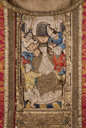 | Keywords: MCC-39455 Rood kazuifel met geel granaatappelpatroon, passie- en opstandingsscènes (3).tif  Artwork nl onbekend nl Kazuifel in vioolvorm van wijnrood zijdedamast met ingeweven gele granaatappels die gevat zijn in een geknoopte guirlande De voering is van effen ongebleekt linnen De rugzijde toont borduurwerk in de vorm van een latijns kruis met in de kolom vier scènes onder elkaar alle vier opgevat als interieurscènes voor een opgehangen gedamasceerd gordijn Bovenaan onder een baldakijn bekroond met een fleuron en onder een rijk netgewelf hangt de gestorven Christus aan het kruis Maria Magdalena omklemt geknield het kruis links ondersteunt Johannes een bezwijmende Maria Op de achtergrond omringen klagende vrouwen en soldaten het kruis De tweede scène laat de Afname van het kruis zien Nicodemus boven en Joseph van Arimathea onder ondersteunen het lichaam van Christus bij de kruisafname Naast hen een derde figuur op een ladder Magdalena knielt nog steeds aan het kruis en strekt de handen naar de voeten van Christus uit Links Maria Johannes en twee vrouwen Daaronder in de kolom de graflegging Gezamenlijk tillen Jozef van Arimathea de schouders ondersteunend en Nicodemus aan het voeteneind Christus in het graf Links knielt Maria Magdalena een hand van Christus omvattend Achter de tombe Johannes en Maria de handen gekruist voor de borst Achter hen verwanten waarschijnlijk Maria Salome en Maria Cleophas De onderste scene laat de Verrijzenis zien Christus stapt gehuld in een mantel met sluiting uit de tombe een kruisvaan in de linkerhand Rondom de tombe vier slapende soldaten De kruisarmen tonen een afwijkend baldakijntype Onder een eenvoudig gotisch gewelf en tussen boogvensters links een afbeelding van Anna te Drieën en rechts van Maria Magdalena Anna met weduwenkap staat met een opengeslagen boek in de linkerhand Voor haar zit een versneden Mariafiguur met Christus op de schoot Rechts een eveneens versneden Maria Magdalena met een zalfbus in de hand De voorkant toont drie lijdenstaferelen Bovenaan de Bespotting van Christus Hij is gekleed in onderkleed en mantel houdt een rietstengel vast en heeft de doornenkroon op het hoofd Twee beulen achter hem slaan met stokken de kroon dieper in zijn hoofd twee andere beulen jouwen hem uit In het middentafereel de hof van Olijven afgezet met een houten palisade Geknield bidt Christus tot zijn Vader voor hem op een rots de lijdenskelk Op de voorgrond dommelen Jacobus Petrus en Johannes In de onderste scène verschijnt Christus voor Pilatus In het midden Pilatus met een joodse puntmuts zijn handen wassend in een bekken dat hem door een dienaar wordt aangereikt Rechts Christus met geboeide handen gehuld in een schamel gewaad Achter hen een menigte soldaten met pieken en een banier Techniek opgehoogd en gehecht gouddraad in de omlijsting de baldakijnen en de achtergronddraperie Mantels en kleding in de lazuurtechniek gezichten in point miniature haren in kettingsteek Bij het lazuurwerk op de zij-armen gaat de zijde over tweedraads gouddraad between 1495 1504 nl zijdedamast floszijde gouddraad Size 127 67 cm Institution Museum Catharijneconvent place of discovery object history exhibition history credit line nl Foto Museum Catharijneconvent Utrecht foto Ruben de Heer accession number Object number 39455 Inventory number ABM t2005 place of creation nl plaats vervaardiging onzeker Noord-Nederland Utrecht https //www catharijneconvent nl/adlib/39455/ View this work on the website of Museum Catharijneconvent Museum Catharijneconvent Cc-zero Textiles in the Museum Catharijneconvent Media contributed by Museum Catharijneconvent Uploaded with pattypan Chasubles in the Museum Catharijneconvent |
