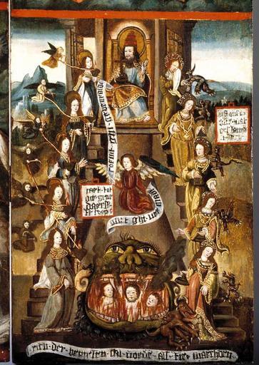 Keywords: MCC-42054 Veelluik met het martelaarschap van de H. Theodosia (62).jpg Artwork nl Anonymous Gelre nl Middenstuk 1 Theodosia verzoekt toelating tot de gevangenis Rechtsboven een engel met banderol waarop de tekst Ghi sijt verhoert die geve die ghi do bidt heb ick gevestigt mit mijnen gelt die martelie te liden 2 Theodosia wordt bij de magistraat ter verantwoording geroepen Op het tekstbord Desen s alch sal ick mitter hulpen des heren voer s en 3 Theodosia ™s marteling aan de hefboom Op het tekstbord Ic ben bereyd dinc voer iezus christo te liden 4a Theodosia aan de schandpaal 4b Theodosia ™s ledematen worden uitgerekt 5 Allegorische voorstelling Christus aan het kruis met het offerlam op zijn schouders; onder het kruis negen schapen Op de voorgrond links een non rechts koning David met een gouden kroon op zijn hoofd en een herdersstaf met schep in beide handen die hij naar de non uitsteekt; tussen hen in ligt een harp Op het tekstbord suster hoede die scapen dier gedacten in die minne des brudegoms iesus opten berch caluarie 6a Theodosia uit het water gered door twee engelen 6b Vijf nonnen en een vrouw in wereldse kledij bezoeken Theodosia in de gevangenis Op het tekstbord min medes elen in cro Christo den enge w ech Het opschrift op de lijst onder de voorstelling is onleesbaar 7 Theodosia voor de wilde dieren geworpen Op het tekstbord nu suldi bekennen hoe vol si vermogen die god mit pueren herten minnen 8 Onthoofding van Theodosia Op het tekstbord dat ic inren tiit des vreden heb vercregen dat sal ic inden striit nie verliesen 9a Verschijning van Theodosia aan haar ouders Op het tekstbord sieh hoe soet die glorie ist daer du mi af beroeven wolste 9b Begrafenis van Theodosia Een zwevende engel met banderol waarop si heft nu salighe vrocht Aan weerszijden van deze taferelen zijn vrouwelijke heiligen afgebeeld steeds twee aan twee met tussen hen in een geknielde non Op de eerste voorstelling links in plaats van een vrouwelijke heilige Maria met kind Links 10a Madonna op de maansikkel en Fides Opschriften / fides 10b Caritas en Spes Opschriften niet leesbaar 11a Agatha en Dorothea Opschriften aghata / doratea 11b Apollonia met attribuut van Agatha tang waarin in plaats van een tand een borst is geklemd en Euphrosia Opschriften appolonia / effrosia 12a Anatolia en Christina Opschriften anatolia / 12b Victoria en Sophia Opschriften victoria / sophia Rechts 13a Margaretha en Gertrudis Opschriften a gretha / gertrudis 13b Ursula en Walburga Opschriften ursula / 14a Catharina en Barbara Opschriften katrina / barbara 14b Agnes en Prisca Opschriften agneta / priska 15a Cecilia en Cunera Opschriften cecilia / cunera 15b Lucia en Clara Opschriften lucia / clara Binnenzijde linkerluiken 16 Kruisdraging met Veronica en Simon van Cyrene 17 Doornenkroning Rechts een als priester geklede heilige met een kelk in de hand en een knielende non 18 Geseling Rechts een H Bisschop 19 Christus in de Hof van Olijven en de stigmatisatie van de Franciscus 20 Besnijdenis Rechts een reguliere kanunnik en een geknielde vrouw in 16de-eeuwse kledij met de attributen van de H Goedele een lantaarn geflankeerd door een engel met een brandende kaars en een duivel met een blaasbalg; daaronder het opschrift gudila 21 Ontkleding van Christus Rechts een heilige met een boek en een ladder 22 Kruisnageling Rechts de apostel Thomas 23 Christus aan het kruis met Maria Johannes en de drie vrouwen Rechts Antonius 24 Bewening Rechts de apostel Paulus en twee geknielde nonnen 25 Christus treedt de wijnpers Links Augustinus rechts een reguliere kanunnik Binnenzijde rechterluiken 26 Aanbidding der koningen 27 Geboorte van Christus Opschrift gloria in excelsis 28a Visitatie 28b Vier nonnen knielend voor een altaar waarop een drieluik met de Kruisiging Achter hen een priester Boven diens hoofd h ia Rechts daarvan een banderol met eenregelige tekst van een lied adv i g i I Fi Filius dn domini 29 Annunciatie Opschrift ave gratia plena 30 Genadestoel Rechtsonder op de voorgrond knielt een non Op het tekstbord god die alle creatueren gescapen heft en ons mit sin dierbaren bloet verlost heft hi wil ock sin gracie geuen ge eit v an der oude naam van de stichtster-non 31 Christus verschijnt aan Maria 32 Hemelvaart van Christus 33 Kroning van Maria 34 Allegorische voorstelling God de Vader gezeten op een troon met op de trappen die naar de troon voeren links de vijf wijze rechts de vijf dwaze maagden; in het midden een engel boven de hellemond met drie verdoemden Op de banderol in de linkerhand van de engel Gae t of Myt ghi vermadi vermaledijden ; op de banderol in zijn rechterhand coemt ghi gebenedide Op het tekstbord bij de wijze maagden gaet tot der gene daer se te coop is Op het tekstbord bij de dwaze maagden geft ons den olie vor ons lamp Op de banderol aan de onderzijde van de voorstelling rick der hemelen sal worden all fiere maechden Buitenzijde linkerluiken Nr 35 36 en 40 t/m 44 zijn gewijd aan de zeven vallen van Christus De voorstellingen zijn zeer verwant aan zeven houtsneden met dit thema gedrukt op één blad getiteld ˜O mensch betracht dy siben vell Christi und dy siben herzenlaydt Marie ™ Wenen Albertina inv nr 1930-70 Zuid-Duitsland ca 1480; zie Marrow 1979 p 82 89 100 106 131 170 pl VIII 35 Christus ™ val voor de kruisnageling zesde val 36 Kruisoprichting zevende val 37 Allegorische voorstelling Christus als Man van Smarten en gebonden aan de geselpaal houdt een rood koord vast dat verbonden is met een knielende non Tekstrol Christus o dochter vollighet my want ic gepassijt bin voor di wilt mij u hert geven om ewich te leuen Tekstrol non here ic offer u myn hert nu ende inder ewicheit Achter de non zeven kleinere opschriften verwijzend naar zeven deugden elk voorafgegaan door een hand met een geselroede waarvan de eerste en de derde onleesbaar zijn 2 die mel it mildheid ; 4 gehoorsamheijt; 5 wakinge; 6 silencia ; 7 arheyt waarheid 38 Allegorische voorstelling In een ommuurde tuin slaat Christus met een hamer op 