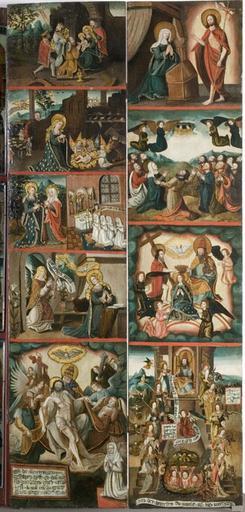 Keywords: MCC-42054 Veelluik met het martelaarschap van de H. Theodosia (3).jpg Artwork nl Anonymous Gelre nl Middenstuk 1 Theodosia verzoekt toelating tot de gevangenis Rechtsboven een engel met banderol waarop de tekst Ghi sijt verhoert die geve die ghi do bidt heb ick gevestigt mit mijnen gelt die martelie te liden 2 Theodosia wordt bij de magistraat ter verantwoording geroepen Op het tekstbord Desen s alch sal ick mitter hulpen des heren voer s en 3 Theodosia ™s marteling aan de hefboom Op het tekstbord Ic ben bereyd dinc voer iezus christo te liden 4a Theodosia aan de schandpaal 4b Theodosia ™s ledematen worden uitgerekt 5 Allegorische voorstelling Christus aan het kruis met het offerlam op zijn schouders; onder het kruis negen schapen Op de voorgrond links een non rechts koning David met een gouden kroon op zijn hoofd en een herdersstaf met schep in beide handen die hij naar de non uitsteekt; tussen hen in ligt een harp Op het tekstbord suster hoede die scapen dier gedacten in die minne des brudegoms iesus opten berch caluarie 6a Theodosia uit het water gered door twee engelen 6b Vijf nonnen en een vrouw in wereldse kledij bezoeken Theodosia in de gevangenis Op het tekstbord min medes elen in cro Christo den enge w ech Het opschrift op de lijst onder de voorstelling is onleesbaar 7 Theodosia voor de wilde dieren geworpen Op het tekstbord nu suldi bekennen hoe vol si vermogen die god mit pueren herten minnen 8 Onthoofding van Theodosia Op het tekstbord dat ic inren tiit des vreden heb vercregen dat sal ic inden striit nie verliesen 9a Verschijning van Theodosia aan haar ouders Op het tekstbord sieh hoe soet die glorie ist daer du mi af beroeven wolste 9b Begrafenis van Theodosia Een zwevende engel met banderol waarop si heft nu salighe vrocht Aan weerszijden van deze taferelen zijn vrouwelijke heiligen afgebeeld steeds twee aan twee met tussen hen in een geknielde non Op de eerste voorstelling links in plaats van een vrouwelijke heilige Maria met kind Links 10a Madonna op de maansikkel en Fides Opschriften / fides 10b Caritas en Spes Opschriften niet leesbaar 11a Agatha en Dorothea Opschriften aghata / doratea 11b Apollonia met attribuut van Agatha tang waarin in plaats van een tand een borst is geklemd en Euphrosia Opschriften appolonia / effrosia 12a Anatolia en Christina Opschriften anatolia / 12b Victoria en Sophia Opschriften victoria / sophia Rechts 13a Margaretha en Gertrudis Opschriften a gretha / gertrudis 13b Ursula en Walburga Opschriften ursula / 14a Catharina en Barbara Opschriften katrina / barbara 14b Agnes en Prisca Opschriften agneta / priska 15a Cecilia en Cunera Opschriften cecilia / cunera 15b Lucia en Clara Opschriften lucia / clara Binnenzijde linkerluiken 16 Kruisdraging met Veronica en Simon van Cyrene 17 Doornenkroning Rechts een als priester geklede heilige met een kelk in de hand en een knielende non 18 Geseling Rechts een H Bisschop 19 Christus in de Hof van Olijven en de stigmatisatie van de Franciscus 20 Besnijdenis Rechts een reguliere kanunnik en een geknielde vrouw in 16de-eeuwse kledij met de attributen van de H Goedele een lantaarn geflankeerd door een engel met een brandende kaars en een duivel met een blaasbalg; daaronder het opschrift gudila 21 Ontkleding van Christus Rechts een heilige met een boek en een ladder 22 Kruisnageling Rechts de apostel Thomas 23 Christus aan het kruis met Maria Johannes en de drie vrouwen Rechts Antonius 24 Bewening Rechts de apostel Paulus en twee geknielde nonnen 25 Christus treedt de wijnpers Links Augustinus rechts een reguliere kanunnik Binnenzijde rechterluiken 26 Aanbidding der koningen 27 Geboorte van Christus Opschrift gloria in excelsis 28a Visitatie 28b Vier nonnen knielend voor een altaar waarop een drieluik met de Kruisiging Achter hen een priester Boven diens hoofd h ia Rechts daarvan een banderol met eenregelige tekst van een lied adv i g i I Fi Filius dn domini 29 Annunciatie Opschrift ave gratia plena 30 Genadestoel Rechtsonder op de voorgrond knielt een non Op het tekstbord god die alle creatueren gescapen heft en ons mit sin dierbaren bloet verlost heft hi wil ock sin gracie geuen ge eit v an der oude naam van de stichtster-non 31 Christus verschijnt aan Maria 32 Hemelvaart van Christus 33 Kroning van Maria 34 Allegorische voorstelling God de Vader gezeten op een troon met op de trappen die naar de troon voeren links de vijf wijze rechts de vijf dwaze maagden; in het midden een engel boven de hellemond met drie verdoemden Op de banderol in de linkerhand van de engel Gae t of Myt ghi vermadi vermaledijden ; op de banderol in zijn rechterhand coemt ghi gebenedide Op het tekstbord bij de wijze maagden gaet tot der gene daer se te coop is Op het tekstbord bij de dwaze maagden geft ons den olie vor ons lamp Op de banderol aan de onderzijde van de voorstelling rick der hemelen sal worden all fiere maechden Buitenzijde linkerluiken Nr 35 36 en 40 t/m 44 zijn gewijd aan de zeven vallen van Christus De voorstellingen zijn zeer verwant aan zeven houtsneden met dit thema gedrukt op één blad getiteld ˜O mensch betracht dy siben vell Christi und dy siben herzenlaydt Marie ™ Wenen Albertina inv nr 1930-70 Zuid-Duitsland ca 1480; zie Marrow 1979 p 82 89 100 106 131 170 pl VIII 35 Christus ™ val voor de kruisnageling zesde val 36 Kruisoprichting zevende val 37 Allegorische voorstelling Christus als Man van Smarten en gebonden aan de geselpaal houdt een rood koord vast dat verbonden is met een knielende non Tekstrol Christus o dochter vollighet my want ic gepassijt bin voor di wilt mij u hert geven om ewich te leuen Tekstrol non here ic offer u myn hert nu ende inder ewicheit Achter de non zeven kleinere opschriften verwijzend naar zeven deugden elk voorafgegaan door een hand met een geselroede waarvan de eerste en de derde onleesbaar zijn 2 die mel it mildheid ; 4 gehoorsamheijt; 5 wakinge; 6 silencia ; 7 arheyt waarheid 38 Allegorische voorstelling In een ommuurde tuin slaat Christus met een hamer op e